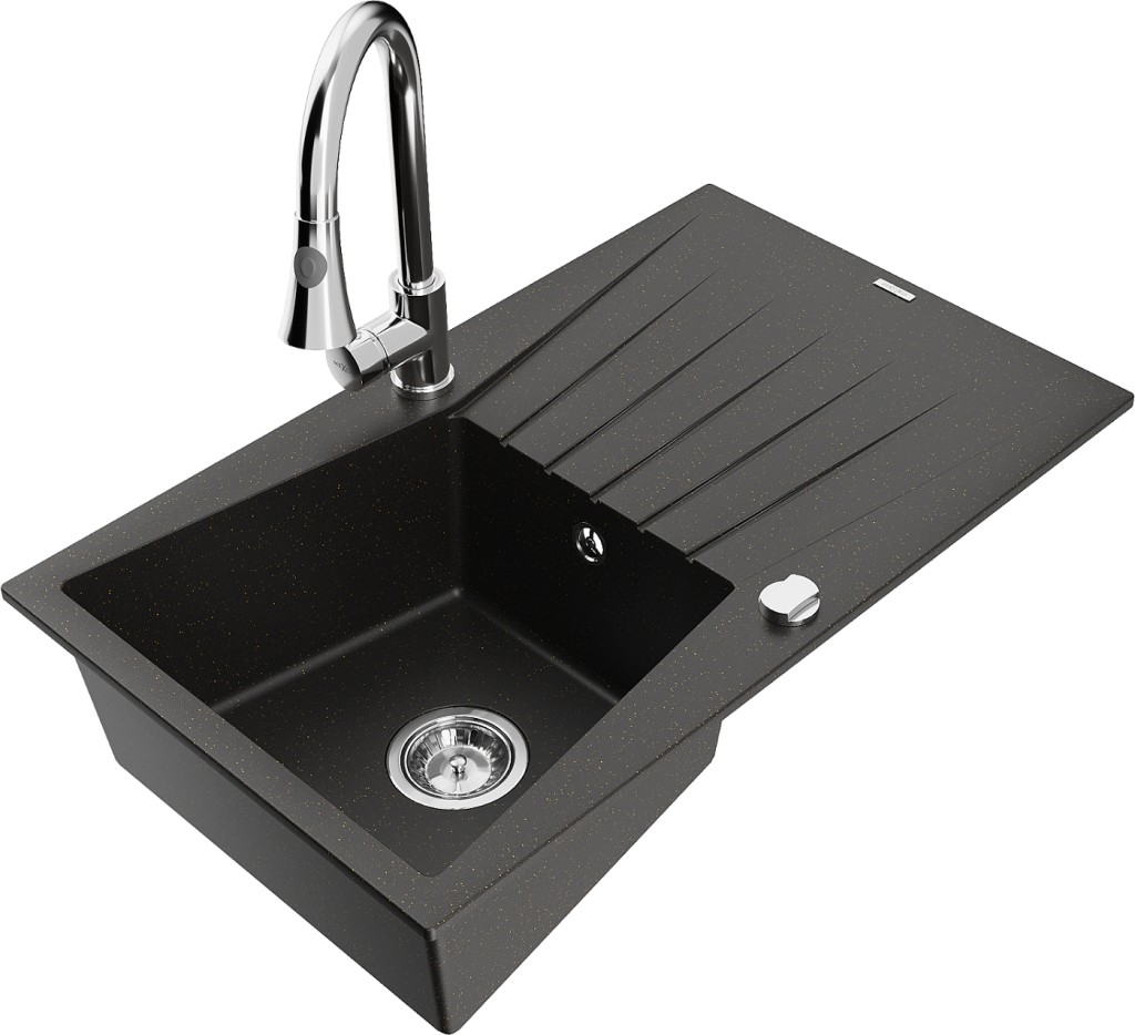 Technické dáta: drez: Rozmer: 775x470x200mm Hĺbka komory: 180 mm Rozmery komory: 410x355 mm Priemer odtoku: ø90 mm Typ: 1-miska s odkvapkávačom Typ: Zapustené do pracovnej dosky Farba: čierna / zlatá metalíza Povrchová úprava sifónu: Chrome Materiál: žula (80% žulové kamenivo, 20% živice) Prepadový otvor: Áno Otvory: (batérie, automatické) 2 Inštalácia: Univerzálna, je možné inštalovať s odkvapkávačom na ľavú alebo pravú stranu Vysoká odolnosť proti poškriabaniu a zmene farby Odolnosť proti tepelným šokom Ľahko čistiteľný povrch kuchynská batéria: Materiál: mosadz Farba: Chrome Hlava: Keramická Prevzdušňovač: Áno Typ: Jedna páka Výška batérie: 380 mm Rozsah výtoku: 252 mm Typ výtoku: Výsuvný(GT) Ean: 5905315030825