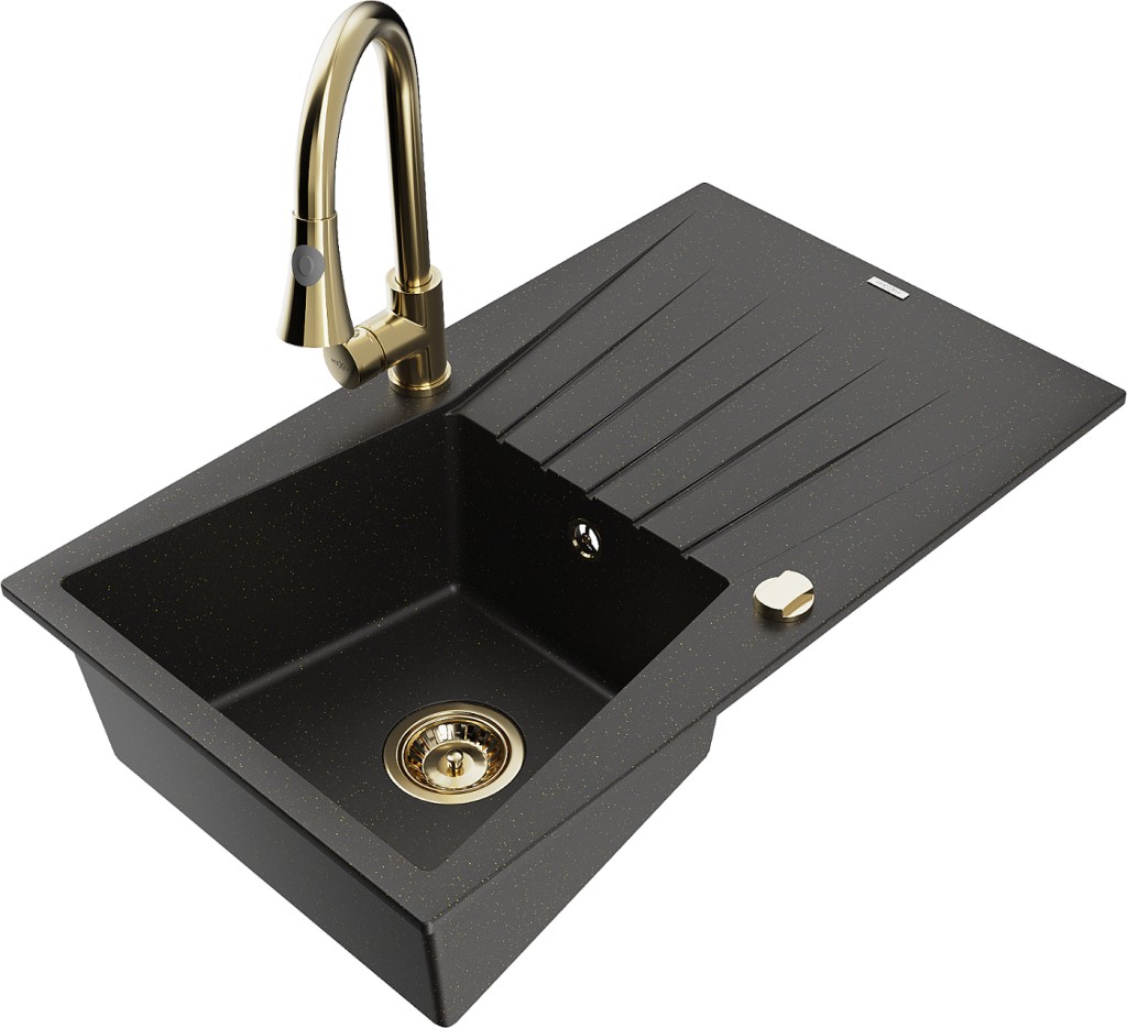 Technické dáta: drez: Rozmer: 775x470x200mm Hĺbka komory: 180 mm Rozmery komory: 410x355 mm Priemer odtoku: ø90 mm Typ: 1-miska s odkvapkávačom Typ: Zapustené do pracovnej dosky Farba: čierna / zlatá metalíza Povrchová úprava sifónu: zlatá Materiál: žula (80% žulové kamenivo, 20% živice) Prepadový otvor: Áno Otvory: (batérie, automatické) 2 Inštalácia: Univerzálna, je možné inštalovať s odkvapkávačom na ľavú alebo pravú stranu Vysoká odolnosť proti poškriabaniu a zmene farby Odolnosť proti tepelným šokom Ľahko čistiteľný povrch kuchynská batéria: Materiál: mosadz Farba: Zlatá Hlava: Keramická Prevzdušňovač: Áno Typ: Jedna páka Výška batérie: 380 mm Rozsah výtoku: 252 mm Typ výtoku: Výsuvný(GT) Ean: 5905315030832