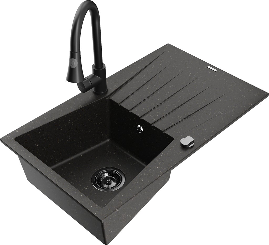 Technické dáta: drez: Rozmer: 775x470x200mm Hĺbka komory: 180 mm Rozmery komory: 410x355 mm Priemer odtoku: ø90 mm Typ: 1-miska s odkvapkávačom Typ: Zapustené do pracovnej dosky Farba: čierna / zlatá metalíza Povrchová úprava sifónu: čierna Materiál: žula (80% žulové kamenivo, 20% živice) Prepadový otvor: Áno Otvory: (batérie, automatické) 2 Inštalácia: Univerzálna, je možné inštalovať s odkvapkávačom na ľavú alebo pravú stranu Vysoká odolnosť proti poškriabaniu a zmene farby Odolnosť proti tepelným šokom Ľahko čistiteľný povrch kuchynská batéria: Materiál: mosadz Čierna farba Hlava: Keramická Prevzdušňovač: Áno Typ: Jedna páka Výška batérie: 380 mm Rozsah výtoku: 252 mm Typ výtoku: Výsuvný(GT) Ean: 5905315030856