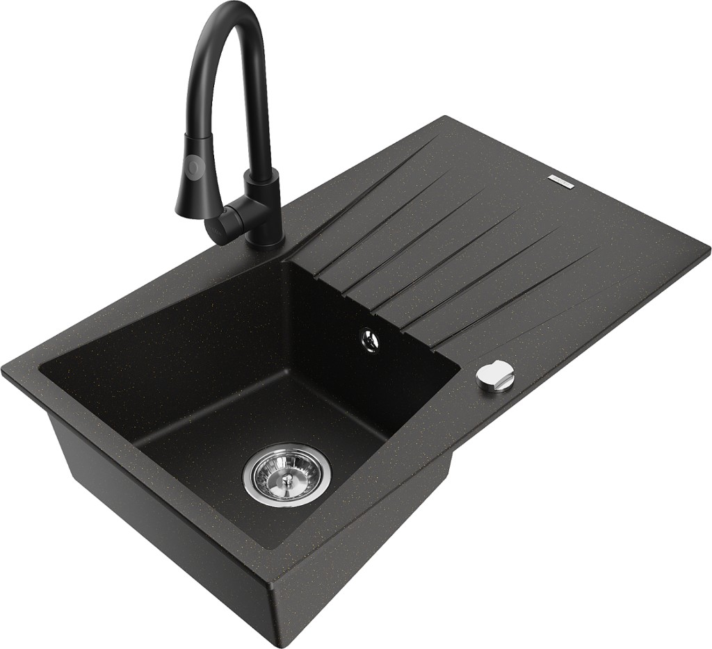 Technické dáta: drez: Rozmer: 775x470x200mm Hĺbka komory: 180 mm Rozmery komory: 410x355 mm Priemer odtoku: ø90 mm Typ: 1-miska s odkvapkávačom Typ: Zapustené do pracovnej dosky Farba: čierna / zlatá metalíza Povrchová úprava sifónu: Chrome Materiál: žula (80% žulové kamenivo, 20% živice) Prepadový otvor: Áno Otvory: (batérie, automatické) 2 Inštalácia: Univerzálna, je možné inštalovať s odkvapkávačom na ľavú alebo pravú stranu Vysoká odolnosť proti poškriabaniu a zmene farby Odolnosť proti tepelným šokom Ľahko čistiteľný povrch kuchynská batéria: Materiál: mosadz Čierna farba Hlava: Keramická Prevzdušňovač: Áno Typ: Jedna páka Výška batérie: 380 mm Rozsah výtoku: 252 mm Typ výtoku: Výsuvný(GT) Ean: 5905315030863