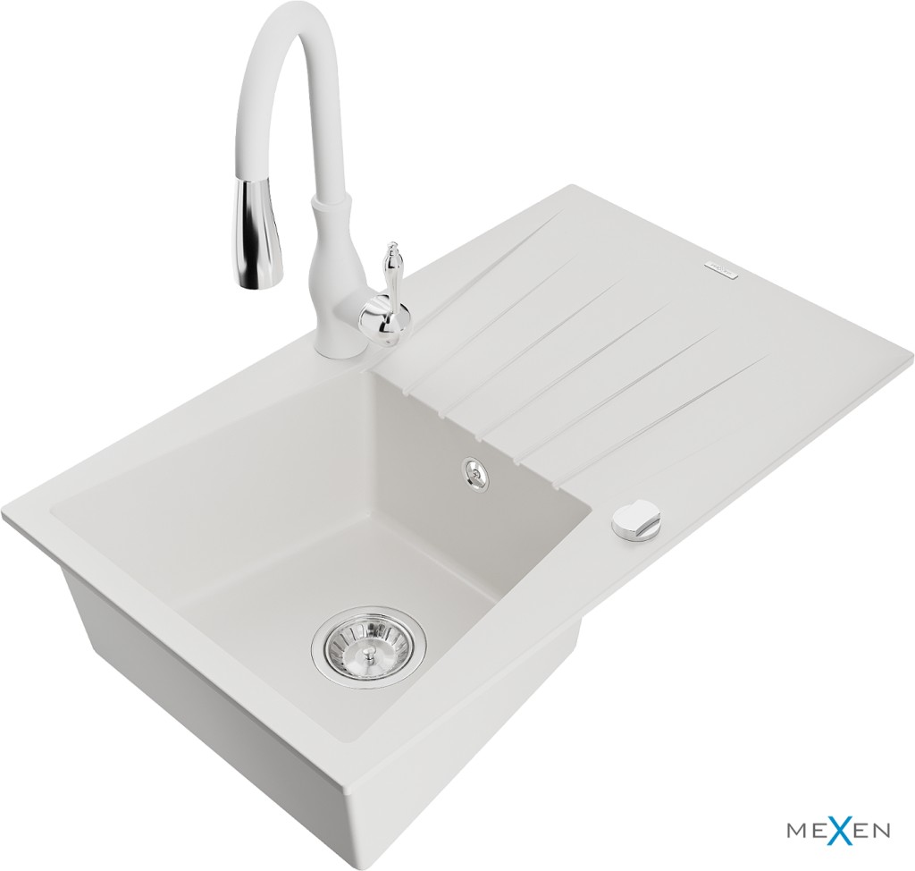 Technické dáta: drez: Rozmer: 775x470x200mm Hĺbka komory: 180 mm Rozmery komory: 410x355 mm Priemer odtoku: ø90 mm Typ: 1-miska s odkvapkávačom Typ: Zapustené do pracovnej dosky biela farba Povrchová úprava sifónu: Chrome Materiál: žula (80% žulové kamenivo, 20% živice) Prepadový otvor: Áno Otvory: (batérie, automatické) 2 Inštalácia: Univerzálna, je možné inštalovať s odkvapkávačom na ľavú alebo pravú stranu Vysoká odolnosť proti poškriabaniu a zmene farby Odolnosť proti tepelným šokom Ľahko čistiteľný povrch kuchynská batéria: Materiál: mosadz biela farba Hlava: Keramická Prevzdušňovač: Áno Typ: Jedna páka Výška batérie: 410 mm Rozsah výtoku: 231 mm(GT) Ean: 5905315035776