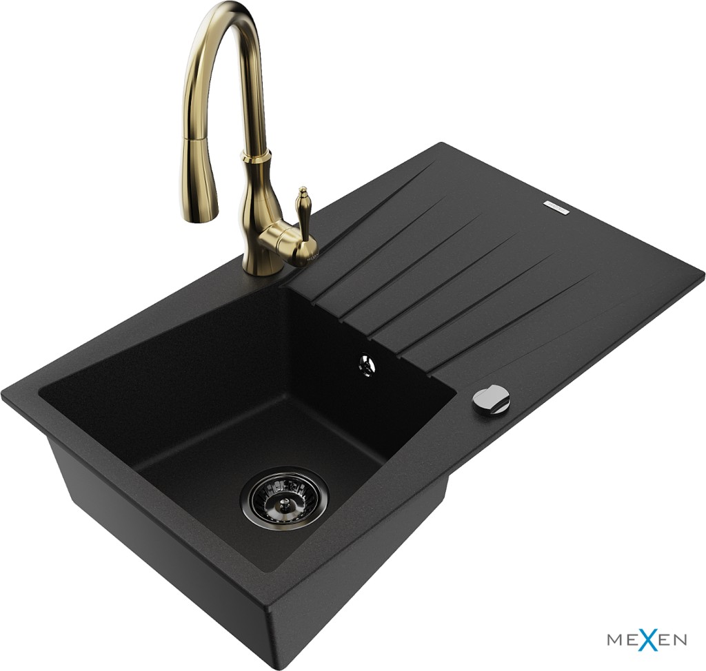 Technické dáta: drez: Rozmer: 775x470x200mm Hĺbka komory: 180 mm Rozmery komory: 410x355 mm Priemer odtoku: ø90 mm Typ: 1-miska s odkvapkávačom Typ: Zapustené do pracovnej dosky Čierna farba Povrchová úprava sifónu: čierna Materiál: žula (80% žulové kamenivo, 20% živice) Prepadový otvor: Áno Otvory: (batérie, automatické) 2 Inštalácia: Univerzálna, je možné inštalovať s odkvapkávačom na ľavú alebo pravú stranu Vysoká odolnosť proti poškriabaniu a zmene farby Odolnosť proti tepelným šokom Ľahko čistiteľný povrch kuchynská batéria: Materiál: mosadz Farba: Zlatá Hlava: Keramická Prevzdušňovač: Áno Typ: Jedna páka Výška batérie: 410 mm Rozsah výtoku: 231 mm(GT) Ean: 5905315036056