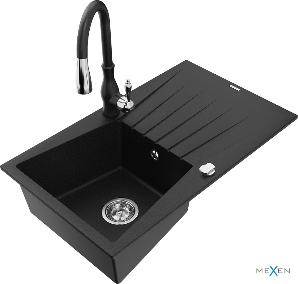 Technické dáta: drez: Rozmer: 775x470x200mm Hĺbka komory: 180 mm Rozmery komory: 410x355 mm Priemer odtoku: ø90 mm Typ: 1-miska s odkvapkávačom Typ: Zapustené do pracovnej dosky Čierna farba Povrchová úprava sifónu: Chrome Materiál: žula (80% žulové kamenivo, 20% živice) Prepadový otvor: Áno Otvory: (batérie, automatické) 2 Inštalácia: Univerzálna, je možné inštalovať s odkvapkávačom na ľavú alebo pravú stranu Vysoká odolnosť proti poškriabaniu a zmene farby Odolnosť proti tepelným šokom Ľahko čistiteľný povrch kuchynská batéria: Materiál: mosadz Čierna farba Hlava: Keramická Prevzdušňovač: Áno Typ: Jedna páka Výška batérie: 410 mm Rozsah výtoku: 231 mm (GT) Ean: 5905315036070
