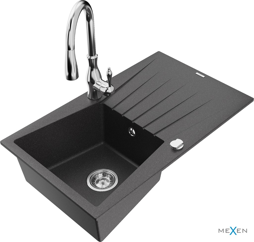 Technické dáta: drez: Rozmer: 775x470x200mm Hĺbka komory: 180 mm Rozmery komory: 410x355 mm Priemer odtoku: ø90 mm Typ: 1-miska s odkvapkávačom Typ: Zapustené do pracovnej dosky Farba: Škvrnitá čierna Povrchová úprava sifónu: Chrome Materiál: žula (80% žulové kamenivo, 20% živice) Prepadový otvor: Áno Otvory: (batérie, automatické) 2 Inštalácia: Univerzálna, je možné inštalovať s odkvapkávačom na ľavú alebo pravú stranu Vysoká odolnosť proti poškriabaniu a zmene farby Odolnosť proti tepelným šokom Ľahko čistiteľný povrch kuchynská batéria: Materiál: mosadz Farba: Chrome Hlava: Keramická Prevzdušňovač: Áno Typ: Jedna páka Výška batérie: 410 mm Rozsah výtoku: 231 mm(GT) Ean: 5905315035981