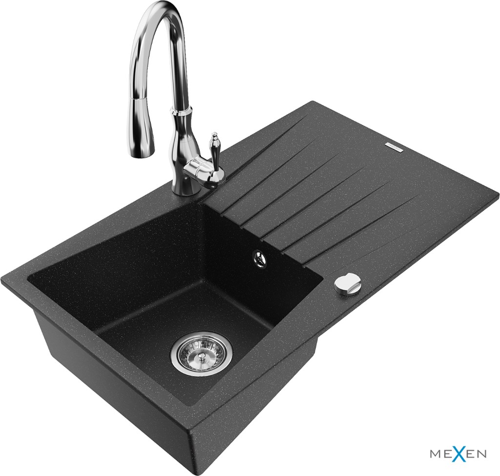 Technické dáta: drez: Rozmer: 775x470x200mm Hĺbka komory: 180 mm Rozmery komory: 410x355 mm Priemer odtoku: ø90 mm Typ: 1-miska s odkvapkávačom Typ: Zapustené do pracovnej dosky Farba: čierna/strieborná metalíza Povrchová úprava sifónu: Chrome Materiál: žula (80% žulové kamenivo, 20% živice) Prepadový otvor: Áno Otvory: (batérie, automatické) 2 Inštalácia: Univerzálna, je možné inštalovať s odkvapkávačom na ľavú alebo pravú stranu Vysoká odolnosť proti poškriabaniu a zmene farby Odolnosť proti tepelným šokom Ľahko čistiteľný povrch kuchynská batéria: Materiál: mosadz Farba: Chrome Hlava: Keramická Prevzdušňovač: Áno Typ: Jedna páka Výška batérie: 410 mm Rozsah výtoku: 231 mm(GT) Ean: 5905315035899