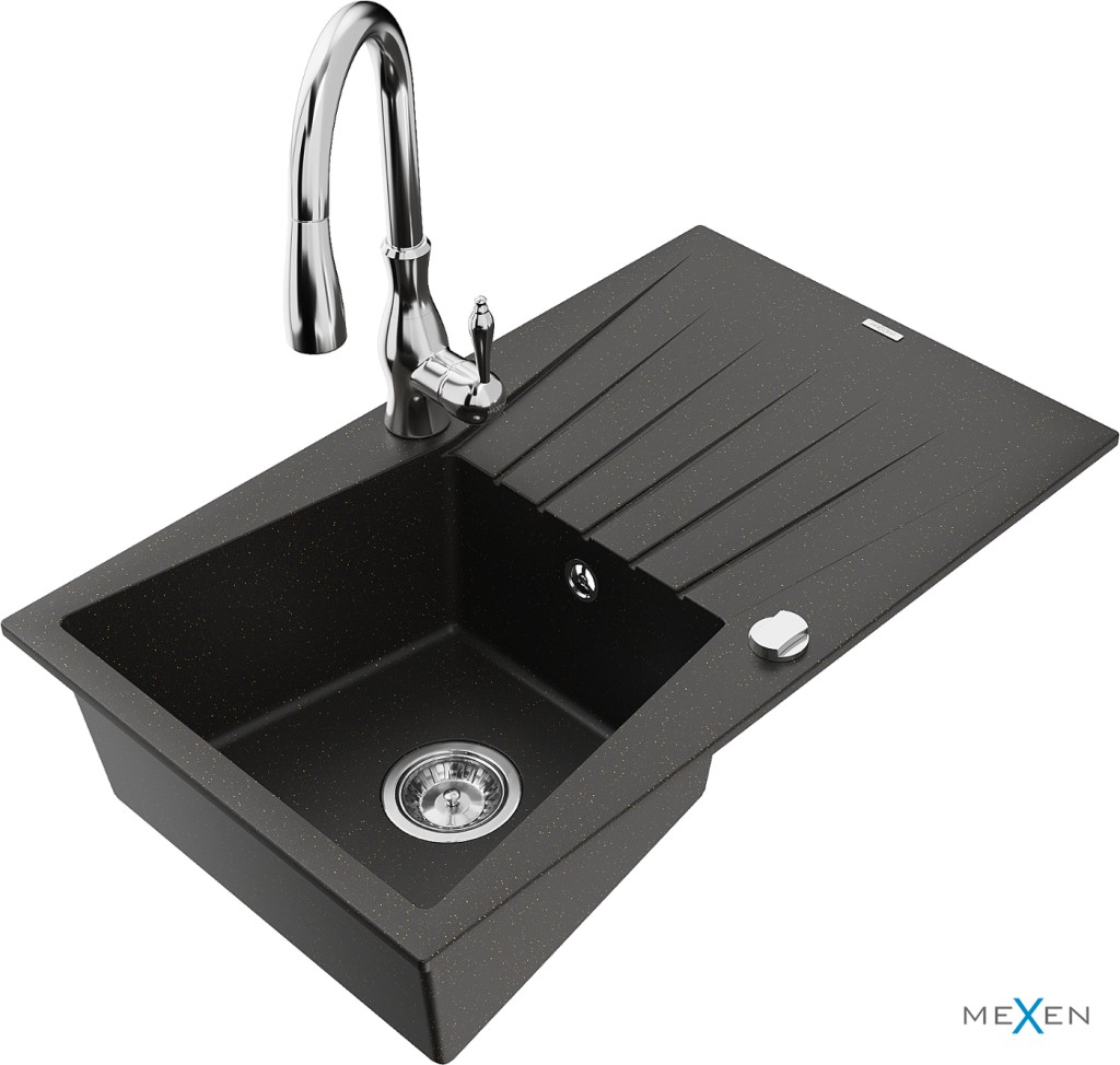 Technické dáta: drez: Rozmer: 775x470x200mm Hĺbka komory: 180 mm Rozmery komory: 410x355 mm Priemer odtoku: ø90 mm Typ: 1-miska s odkvapkávačom Typ: Zapustené do pracovnej dosky Farba: čierna / zlatá metalíza Povrchová úprava sifónu: Chrome Materiál: žula (80% žulové kamenivo, 20% živice) Prepadový otvor: Áno Otvory: (batérie, automatické) 2 Inštalácia: Univerzálna, je možné inštalovať s odkvapkávačom na ľavú alebo pravú stranu Vysoká odolnosť proti poškriabaniu a zmene farby Odolnosť proti tepelným šokom Ľahko čistiteľný povrch kuchynská batéria: Materiál: mosadz Farba: Chrome Hlava: Keramická Prevzdušňovač: Áno Typ: Jedna páka Výška batérie: 410 mm Rozsah výtoku: 231 mm(GT) Ean: 5905315035936