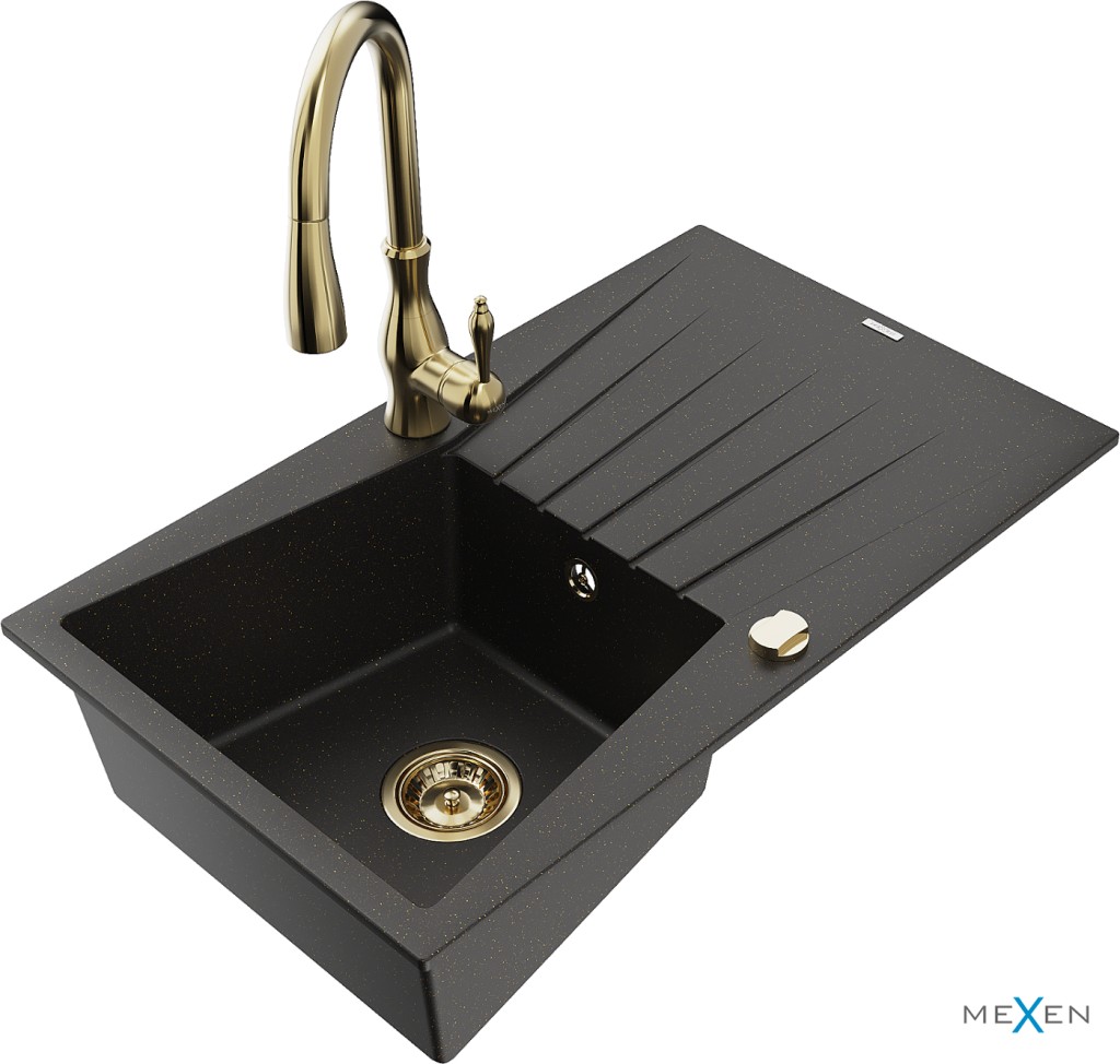 Technické dáta: drez: Rozmer: 775x470x200mm Hĺbka komory: 180 mm Rozmery komory: 410x355 mm Priemer odtoku: ø90 mm Typ: 1-miska s odkvapkávačom Typ: Zapustené do pracovnej dosky Farba: čierna / zlatá metalíza Povrchová úprava sifónu: zlatá Materiál: žula (80% žulové kamenivo, 20% živice) Prepadový otvor: Áno Otvory: (batérie, automatické) 2 Inštalácia: Univerzálna, je možné inštalovať s odkvapkávačom na ľavú alebo pravú stranu Vysoká odolnosť proti poškriabaniu a zmene farby Odolnosť proti tepelným šokom Ľahko čistiteľný povrch kuchynská batéria: Materiál: mosadz Farba: Zlatá Hlava: Keramická Prevzdušňovač: Áno Typ: Jedna páka Výška batérie: 410 mm Rozsah výtoku: 231 mm(GT) Ean: 5905315035943