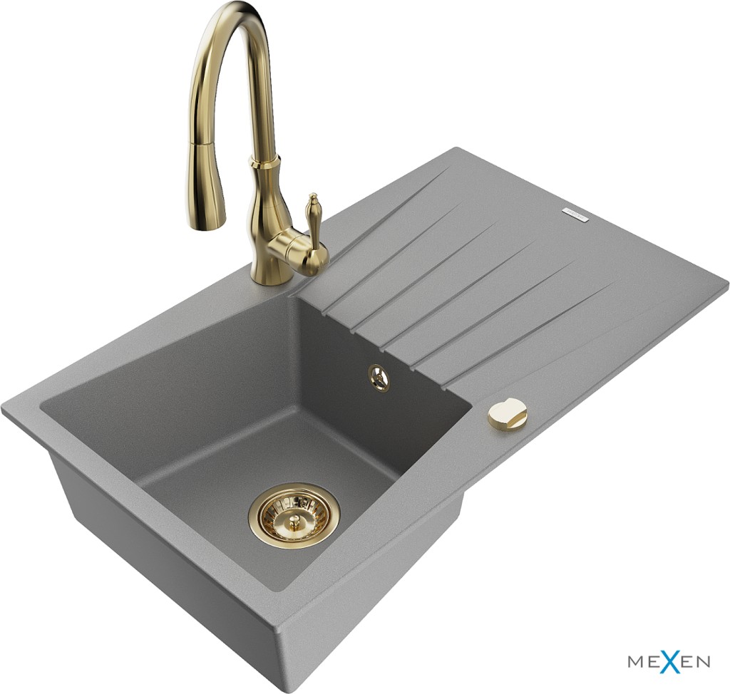Technické dáta: drez: Rozmer: 775x470x200mm Hĺbka komory: 180 mm Rozmery komory: 410x355 mm Priemer odtoku: ø90 mm Typ: 1-miska s odkvapkávačom Typ: Zapustené do pracovnej dosky Šedá farba Povrchová úprava sifónu: zlatá Materiál: žula (80% žulové kamenivo, 20% živice) Prepadový otvor: Áno Otvory: (batérie, automatické) 2 Inštalácia: Univerzálna, je možné inštalovať s odkvapkávačom na ľavú alebo pravú stranu Vysoká odolnosť proti poškriabaniu a zmene farby Odolnosť proti tepelným šokom Ľahko čistiteľný povrch kuchynská batéria: Materiál: mosadz Farba: Zlatá Hlava: Keramická Prevzdušňovač: Áno Typ: Jedna páka Výška batérie: 410 mm Rozsah výtoku: 231 mm(GT) Ean: 5905315035851