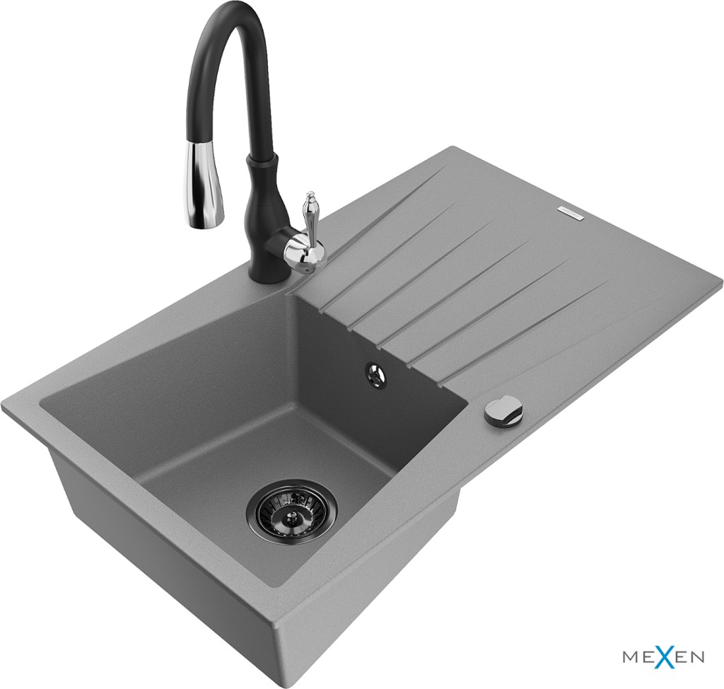 Technické dáta: drez: Rozmer: 775x470x200mm Hĺbka komory: 180 mm Rozmery komory: 410x355 mm Priemer odtoku: ø90 mm Typ: 1-miska s odkvapkávačom Typ: Zapustené do pracovnej dosky Šedá farba Povrchová úprava sifónu: čierna Materiál: žula (80% žulové kamenivo, 20% živice) Prepadový otvor: Áno Otvory: (batérie, automatické) 2 Inštalácia: Univerzálna, je možné inštalovať s odkvapkávačom na ľavú alebo pravú stranu Vysoká odolnosť proti poškriabaniu a zmene farby Odolnosť proti tepelným šokom Ľahko čistiteľný povrch kuchynská batéria: Materiál: mosadz Čierna farba Hlava: Keramická Prevzdušňovač: Áno Typ: Jedna páka Výška batérie: 410 mm Rozsah výtoku: 231 mm(GT) Ean: 5905315035875