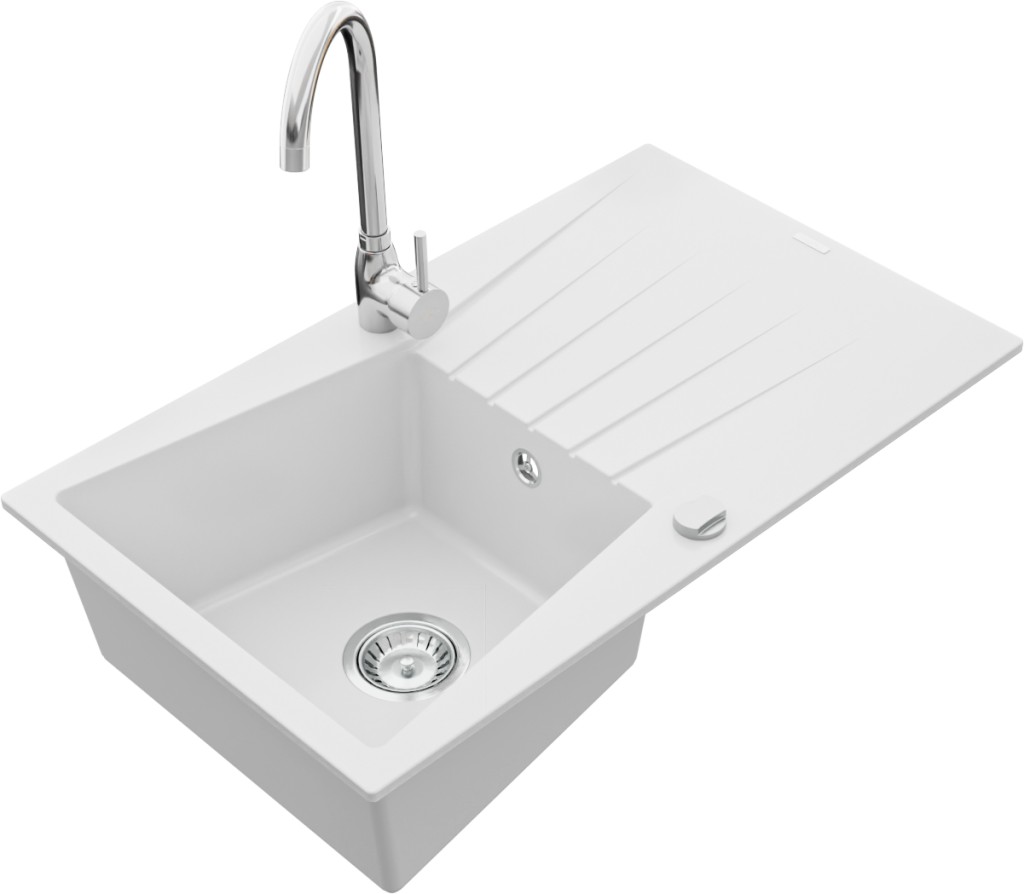 Technické dáta: drez: Rozmer: 775x470x200mm Hĺbka komory: 180 mm Rozmery komory: 410x355 mm Priemer odtoku: ø90 mm Typ: 1-miska s odkvapkávačom Typ: Zapustené do pracovnej dosky biela farba Povrchová úprava sifónu: Chrome Materiál: žula (80% žulové kamenivo, 20% živice) Prepadový otvor: Áno Otvory: (batérie, automatické) 2 Inštalácia: Univerzálna, je možné inštalovať s odkvapkávačom na ľavú alebo pravú stranu Vysoká odolnosť proti poškriabaniu a zmene farby Odolnosť proti tepelným šokom Ľahko čistiteľný povrch kuchynská batéria: Materiál: mosadz Farba: Chrome Hlava: Keramická Prevzdušňovač: Áno Výška batérie: 335 mm Rozsah výtoku: 180 mm(GT) Ean: 5907709160767