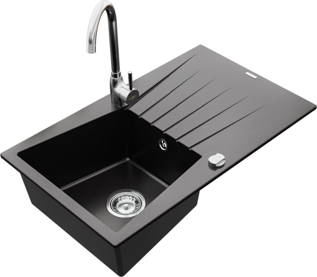 Technické dáta: drez: Rozmer: 775x470x200mm Hĺbka komory: 180 mm Rozmery komory: 410x355 mm Priemer odtoku: ø90 mm Typ: 1-miska s odkvapkávačom Typ: Zapustené do pracovnej dosky Čierna farba Povrchová úprava sifónu: Chrome Materiál: žula (80% žulové kamenivo, 20% živice) Prepadový otvor: Áno Otvory: (batérie, automatické) 2 Inštalácia: Univerzálna, je možné inštalovať s odkvapkávačom na ľavú alebo pravú stranu Vysoká odolnosť proti poškriabaniu a zmene farby Odolnosť proti tepelným šokom Ľahko čistiteľný povrch kuchynská batéria: Materiál: mosadz Farba: Chrome Hlava: Keramická Prevzdušňovač: Áno Výška batérie: 335 mm Rozsah výtoku: 180 mm (GT) Ean: 5907709160880