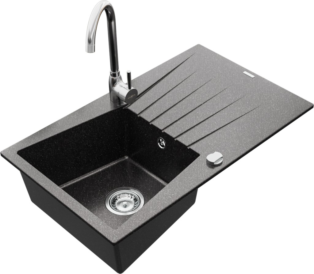 Technické dáta: drez: Rozmer: 775x470x200mm Hĺbka komory: 180 mm Rozmery komory: 410x355 mm Priemer odtoku: ø90 mm Typ: 1-miska s odkvapkávačom Typ: Zapustené do pracovnej dosky Farba: Škvrnitá čierna Povrchová úprava sifónu: Chrome Materiál: žula (80% žulové kamenivo, 20% živice) Prepadový otvor: Áno Otvory: (batérie, automatické) 2 Inštalácia: Univerzálna, je možné inštalovať s odkvapkávačom na ľavú alebo pravú stranu Vysoká odolnosť proti poškriabaniu a zmene farby Odolnosť proti tepelným šokom Ľahko čistiteľný povrch kuchynská batéria: Materiál: mosadz Farba: Chrome Hlava: Keramická Prevzdušňovač: Áno Výška batérie: 335 mm Rozsah výtoku: 180 mm(GT) Ean: 5907709160866