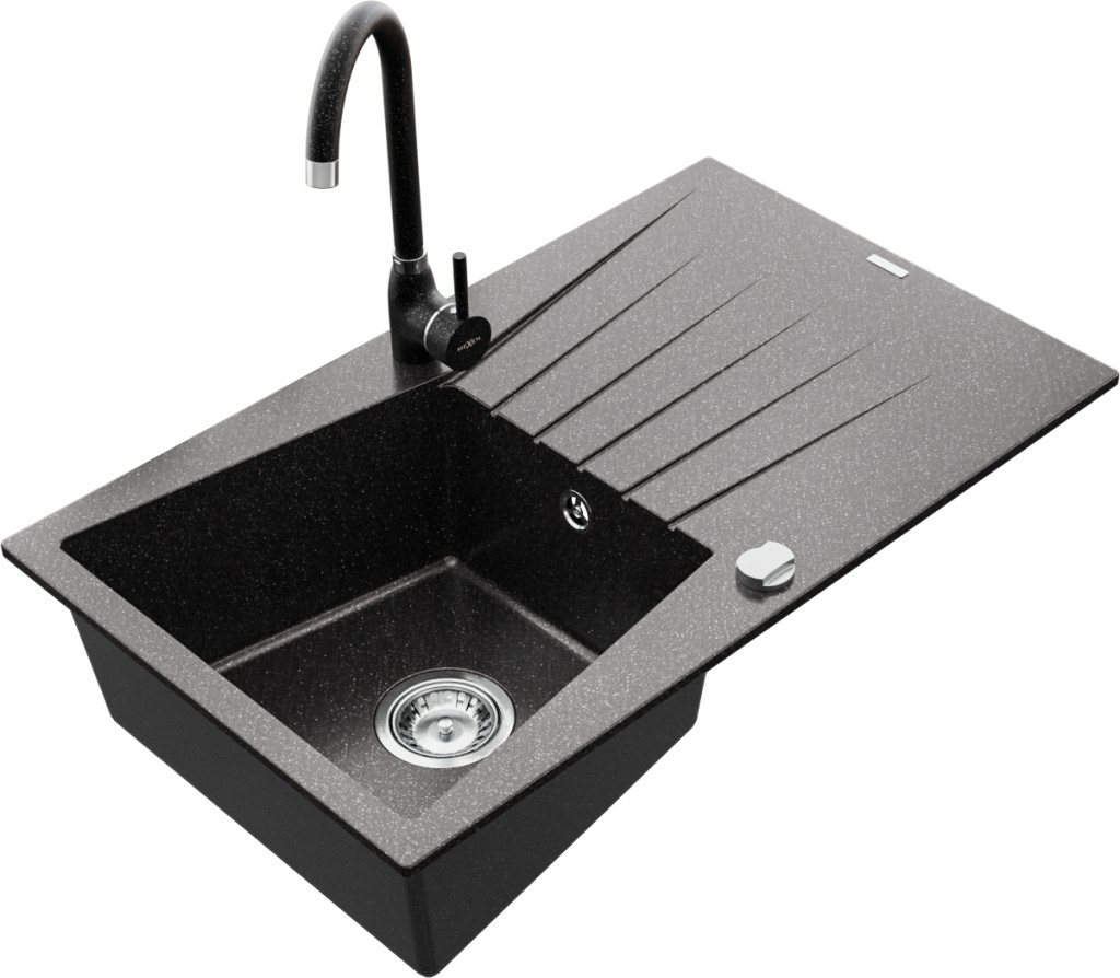 Technické dáta: drez: Rozmer: 775x470x200mm Hĺbka komory: 180 mm Rozmery komory: 410x355 mm Priemer odtoku: ø90 mm Typ: 1-miska s odkvapkávačom Typ: Zapustené do pracovnej dosky Farba: Škvrnitá čierna Povrchová úprava sifónu: Chrome Materiál: žula (80% žulové kamenivo, 20% živice) Prepadový otvor: Áno Otvory: (batérie, automatické) 2 Inštalácia: Univerzálna, je možné inštalovať s odkvapkávačom na ľavú alebo pravú stranu Vysoká odolnosť proti poškriabaniu a zmene farby Odolnosť proti tepelným šokom Ľahko čistiteľný povrch kuchynská batéria: Materiál: mosadz Farba: Škvrnitá čierna Hlava: Keramická Prevzdušňovač: Áno Výška batérie: 335 mm Rozsah výtoku: 180 mm(GT) Ean: 5907709160873