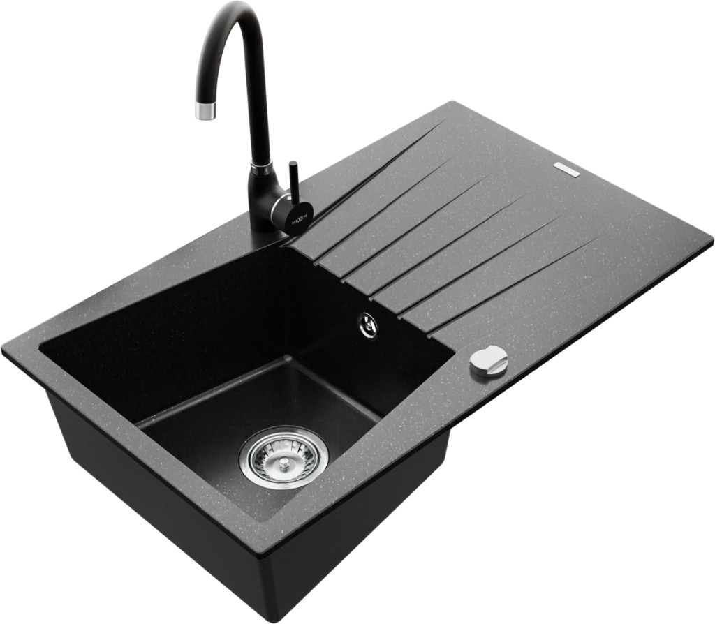 Technické dáta: drez: Rozmer: 775x470x200mm Hĺbka komory: 180 mm Rozmery komory: 410x355 mm Priemer odtoku: ø90 mm Typ: 1-miska s odkvapkávačom Typ: Zapustené do pracovnej dosky Farba: čierna/strieborná metalíza Povrchová úprava sifónu: Chrome Materiál: žula (80% žulové kamenivo, 20% živice) Prepadový otvor: Áno Otvory: (batérie, automatické) 2 Inštalácia: Univerzálna, je možné inštalovať s odkvapkávačom na ľavú alebo pravú stranu Vysoká odolnosť proti poškriabaniu a zmene farby Odolnosť proti tepelným šokom Ľahko čistiteľný povrch kuchynská batéria: Materiál: mosadz Čierna farba Hlava: Keramická Prevzdušňovač: Áno Výška batérie: 335 mm Rozsah výtoku: 180 mm(GT) Ean: 5907709160835