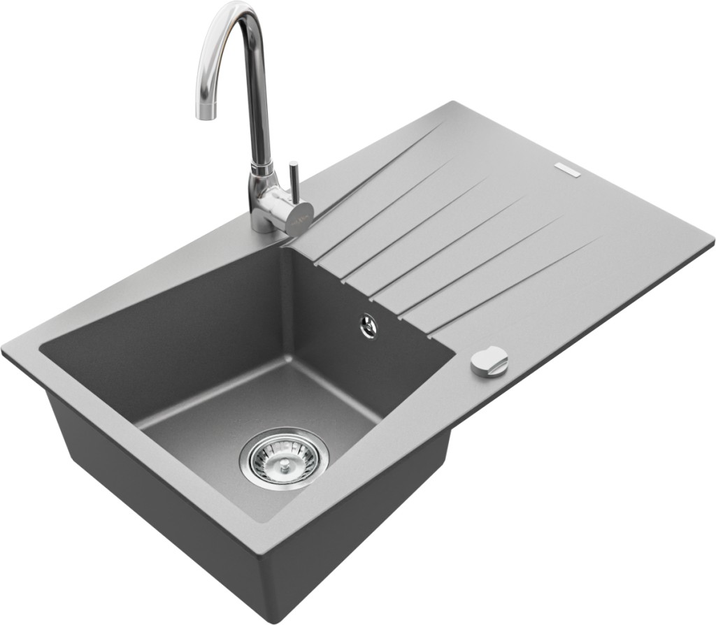Technické dáta: drez: Rozmer: 775x470x200mm Hĺbka komory: 180 mm Rozmery komory: 410x355 mm Priemer odtoku: ø90 mm Typ: 1-miska s odkvapkávačom Typ: Zapustené do pracovnej dosky Šedá farba Povrchová úprava sifónu: Chrome Materiál: žula (80% žulové kamenivo, 20% živice) Prepadový otvor: Áno Otvory: (batérie, automatické) 2 Inštalácia: Univerzálna, je možné inštalovať s odkvapkávačom na ľavú alebo pravú stranu Vysoká odolnosť proti poškriabaniu a zmene farby Odolnosť proti tepelným šokom Ľahko čistiteľný povrch kuchynská batéria: Materiál: mosadz Farba: Chrome Hlava: Keramická Prevzdušňovač: Áno Výška batérie: 335 mm Rozsah výtoku: 180 mm(GT) Ean: 5907709160804