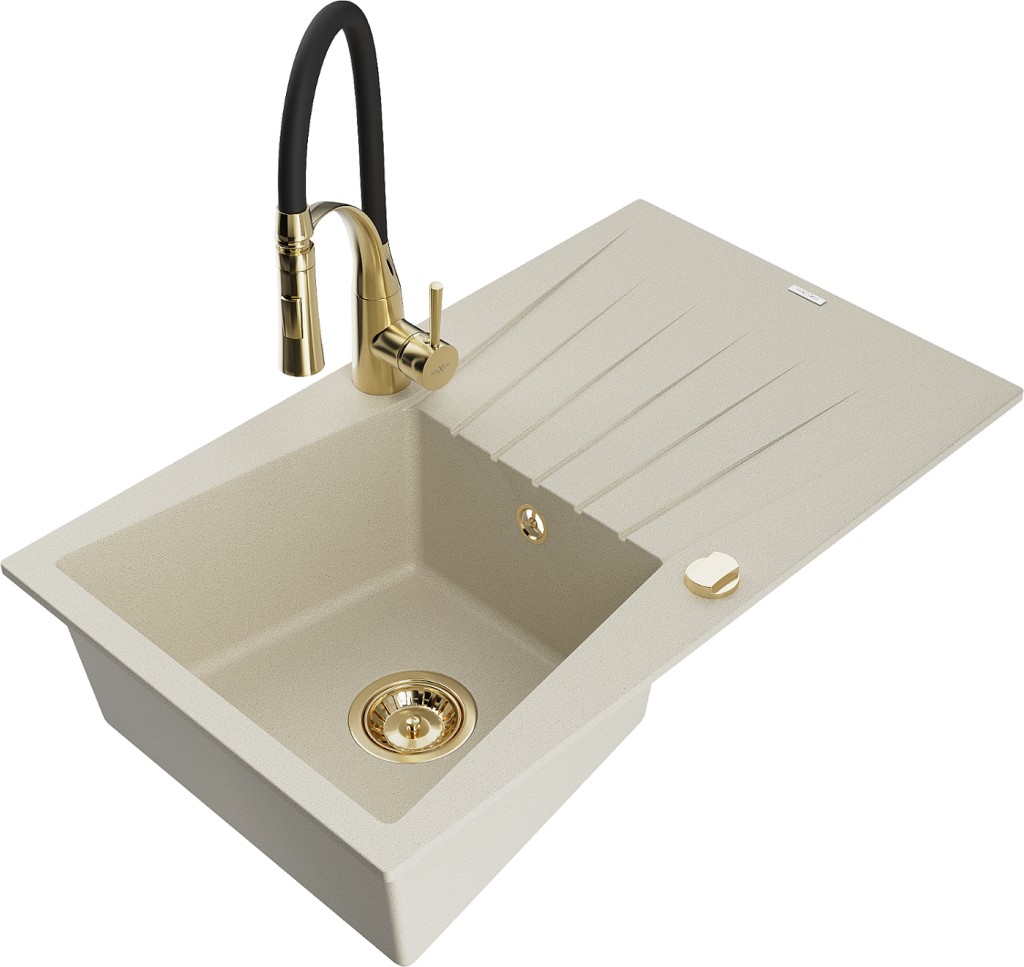 Technické dáta: drez: Rozmer: 775x470x200mm Hĺbka komory: 180 mm Rozmery komory: 410x355 mm Priemer odtoku: ø90 mm Typ: 1-miska s odkvapkávačom Typ: Zapustené do pracovnej dosky Farba béžová Povrchová úprava sifónu: zlatá Materiál: žula (80% žulové kamenivo, 20% živice) Prepadový otvor: Áno Otvory: (batérie, automatické) 2 Inštalácia: Univerzálna, je možné inštalovať s odkvapkávačom na ľavú alebo pravú stranu Vysoká odolnosť proti poškriabaniu a zmene farby Odolnosť proti tepelným šokom Ľahko čistiteľný povrch kuchynská batéria: Materiál: mosadz Farba: Zlatá/Čierna Hlava: Keramická Prevzdušňovač: Áno Typ: Jedna páka Výška batérie: 430 mm Rozsah výtoku: 185 mm Batéria má výsuvný výtok(GT) Ean: 5905315047229