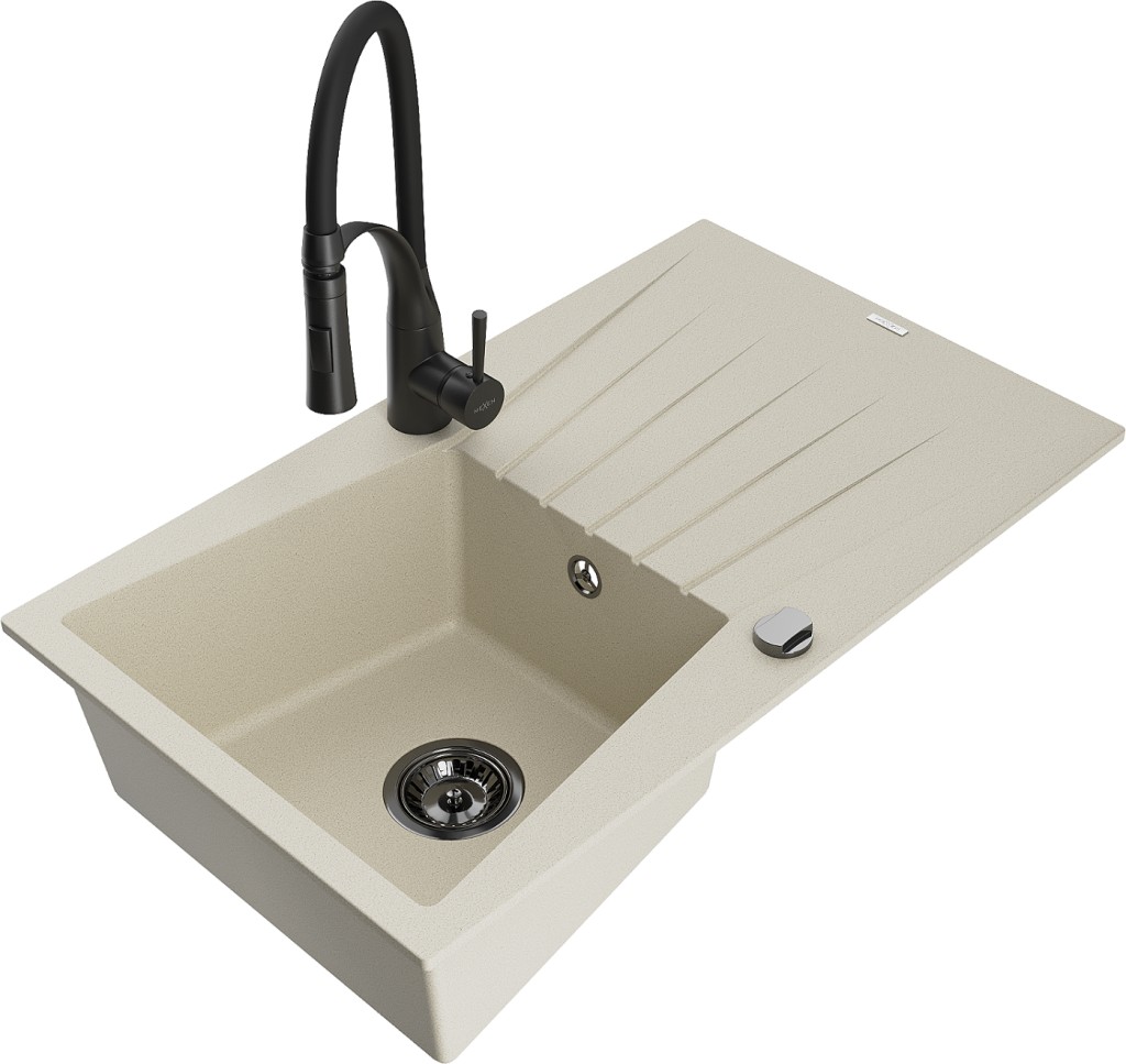 Technické dáta: drez: Rozmer: 775x470x200mm Hĺbka komory: 180 mm Rozmery komory: 410x355 mm Priemer odtoku: ø90 mm Typ: 1-miska s odkvapkávačom Typ: Zapustené do pracovnej dosky Farba béžová Povrchová úprava sifónu: čierna Materiál: žula (80% žulové kamenivo, 20% živice) Prepadový otvor: Áno Otvory: (batérie, automatické) 2 Inštalácia: Univerzálna, je možné inštalovať s odkvapkávačom na ľavú alebo pravú stranu Vysoká odolnosť proti poškriabaniu a zmene farby Odolnosť proti tepelným šokom Ľahko čistiteľný povrch kuchynská batéria: Materiál: mosadz Čierna farba Hlava: Keramická Prevzdušňovač: Áno Typ: Jedna páka Výška batérie: 430 mm Rozsah výtoku: 185 mm Batéria má výsuvný výtok(GT) Ean: 5905315047243