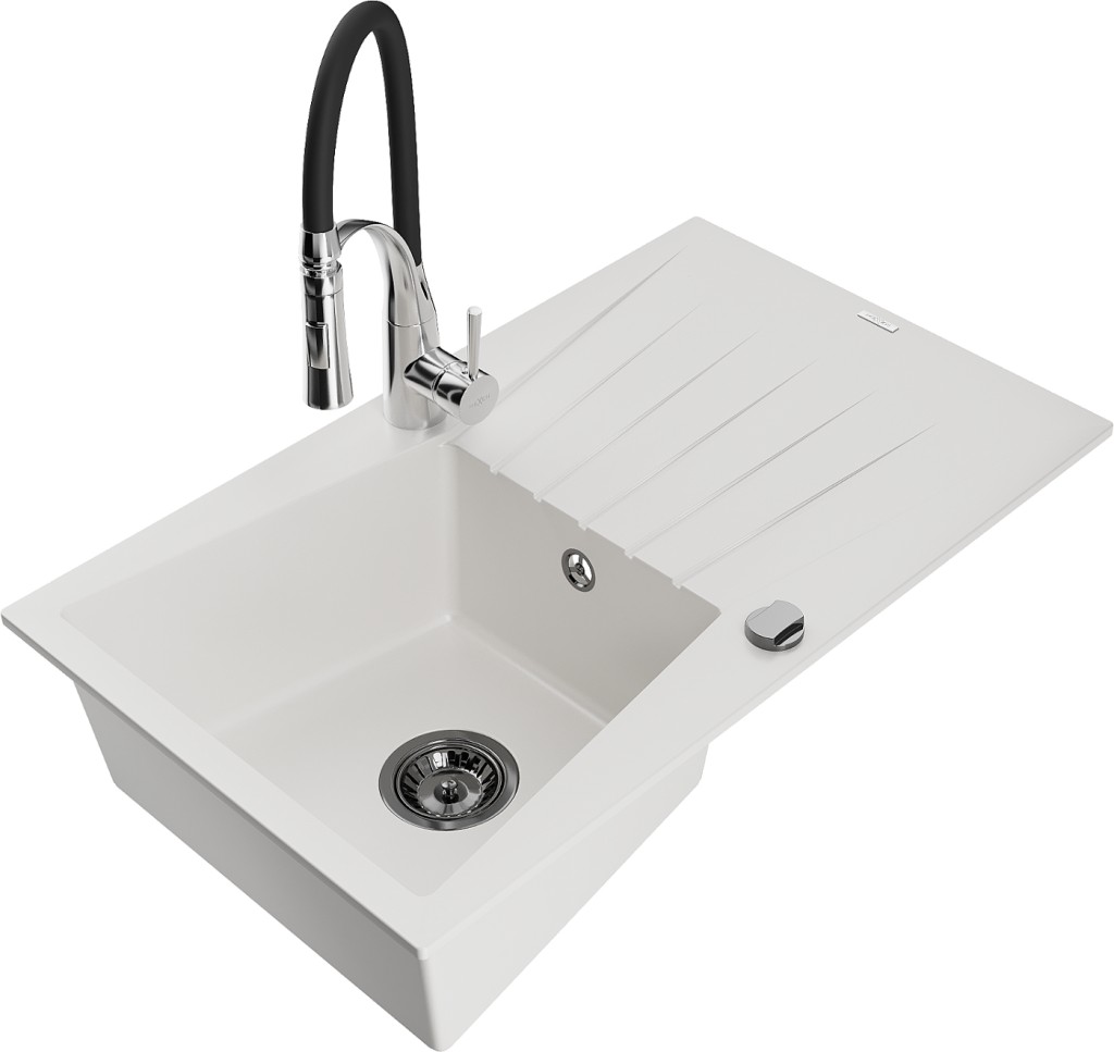Technické dáta: drez: Rozmer: 775x470x200mm Hĺbka komory: 180 mm Rozmery komory: 410x355 mm Priemer odtoku: ø90 mm Typ: 1-miska s odkvapkávačom Typ: Zapustené do pracovnej dosky biela farba Povrchová úprava sifónu: čierna Materiál: žula (80% žulové kamenivo, 20% živice) Prepadový otvor: Áno Otvory: (batérie, automatické) 2 Inštalácia: Univerzálna, je možné inštalovať s odkvapkávačom na ľavú alebo pravú stranu Vysoká odolnosť proti poškriabaniu a zmene farby Odolnosť proti tepelným šokom Ľahko čistiteľný povrch kuchynská batéria: Materiál: mosadz Farba: chróm/čierna Hlava: Keramická Prevzdušňovač: Áno Typ: Jedna páka Výška batérie: 430 mm Rozsah výtoku: 185 mm Batéria má výsuvný výtok(GT) Ean: 5905315047151