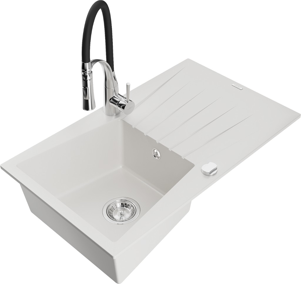 Technické dáta: drez: Rozmer: 775x470x200mm Hĺbka komory: 180 mm Rozmery komory: 410x355 mm Priemer odtoku: ø90 mm Typ: 1-miska s odkvapkávačom Typ: Zapustené do pracovnej dosky biela farba Povrchová úprava sifónu: Chrome Materiál: žula (80% žulové kamenivo, 20% živice) Prepadový otvor: Áno Otvory: (batérie, automatické) 2 Inštalácia: Univerzálna, je možné inštalovať s odkvapkávačom na ľavú alebo pravú stranu Vysoká odolnosť proti poškriabaniu a zmene farby Odolnosť proti tepelným šokom Ľahko čistiteľný povrch kuchynská batéria: Materiál: mosadz Farba: chróm/čierna Hlava: Keramická Prevzdušňovač: Áno Typ: Jedna páka Výška batérie: 430 mm Rozsah výtoku: 185 mm Batéria má výsuvný výtok(GT) Ean: 5905315047144