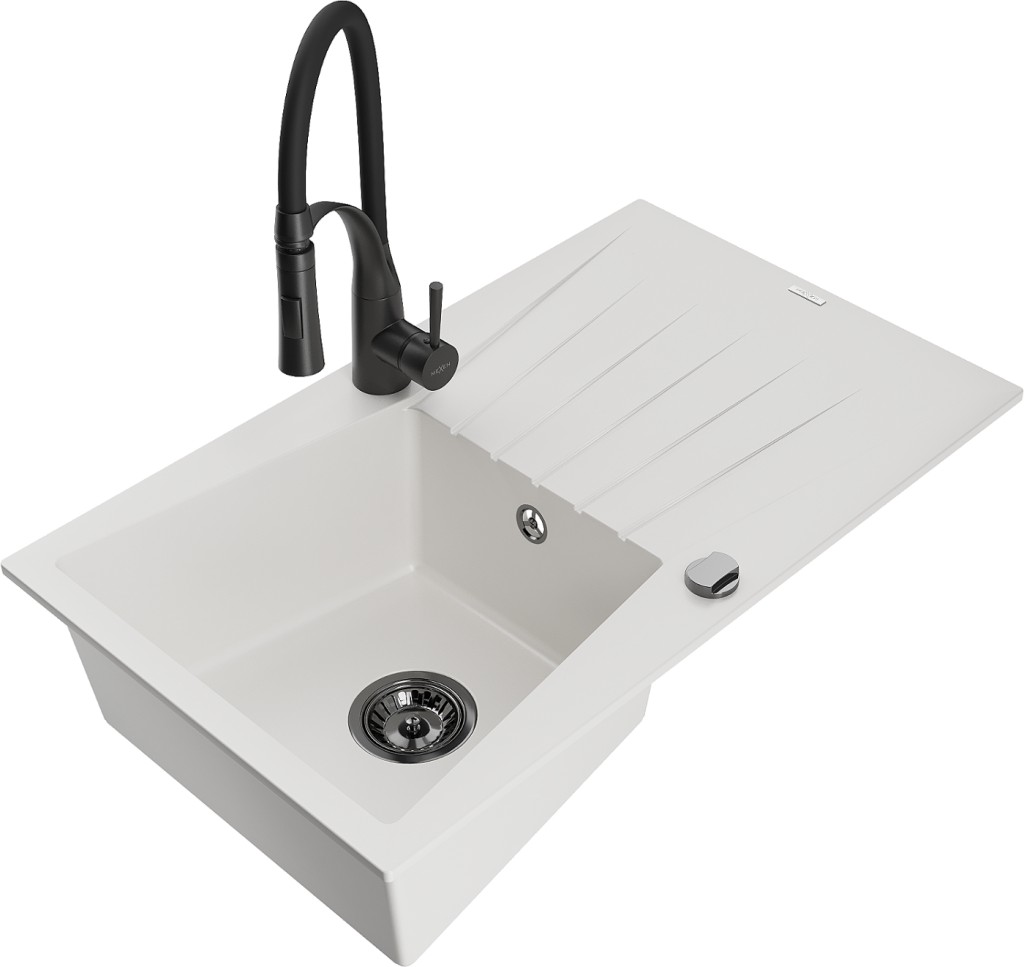Technické dáta: drez: Rozmer: 775x470x200mm Hĺbka komory: 180 mm Rozmery komory: 410x355 mm Priemer odtoku: ø90 mm Typ: 1-miska s odkvapkávačom Typ: Zapustené do pracovnej dosky biela farba Povrchová úprava sifónu: čierna Materiál: žula (80% žulové kamenivo, 20% živice) Prepadový otvor: Áno Otvory: (batérie, automatické) 2 Inštalácia: Univerzálna, je možné inštalovať s odkvapkávačom na ľavú alebo pravú stranu Vysoká odolnosť proti poškriabaniu a zmene farby Odolnosť proti tepelným šokom Ľahko čistiteľný povrch kuchynská batéria: Materiál: mosadz Čierna farba Hlava: Keramická Prevzdušňovač: Áno Typ: Jedna páka Výška batérie: 430 mm Rozsah výtoku: 185 mm Batéria má výsuvný výtok(GT) Ean: 5905315047182