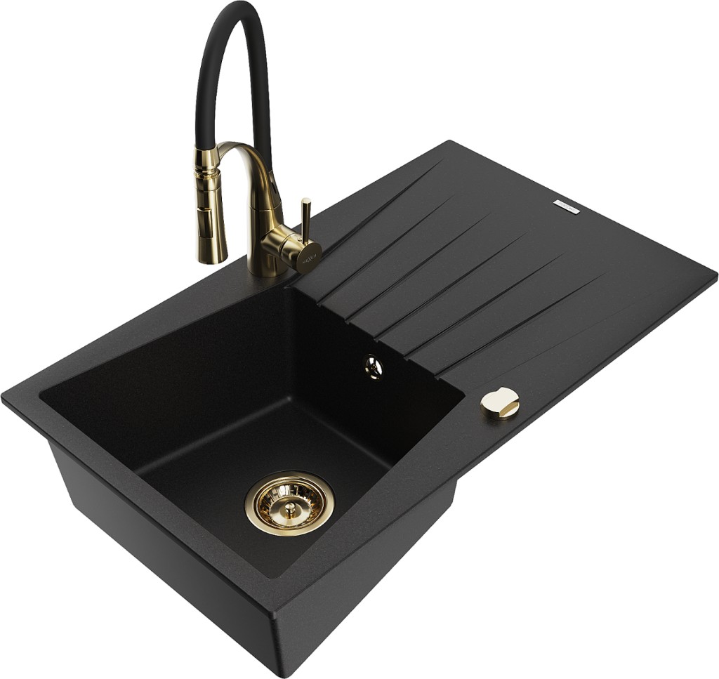 Technické dáta: drez: Rozmer: 775x470x200mm Hĺbka komory: 180 mm Rozmery komory: 410x355 mm Priemer odtoku: ø90 mm Typ: 1-miska s odkvapkávačom Typ: Zapustené do pracovnej dosky Čierna farba Povrchová úprava sifónu: zlatá Materiál: žula (80% žulové kamenivo, 20% živice) Prepadový otvor: Áno Otvory: (batérie, automatické) 2 Inštalácia: Univerzálna, je možné inštalovať s odkvapkávačom na ľavú alebo pravú stranu Vysoká odolnosť proti poškriabaniu a zmene farby Odolnosť proti tepelným šokom Ľahko čistiteľný povrch kuchynská batéria: Materiál: mosadz Farba: Zlatá/Čierna Hlava: Keramická Prevzdušňovač: Áno Typ: Jedna páka Výška batérie: 430 mm Rozsah výtoku: 185 mm Batéria má výsuvný výtok(GT) Ean: 5905315047526