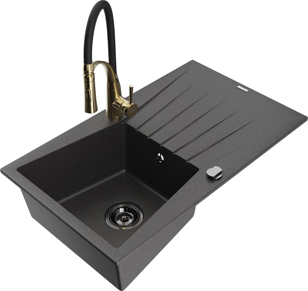 Technické dáta: drez: Rozmer: 775x470x200mm Hĺbka komory: 180 mm Rozmery komory: 410x355 mm Priemer odtoku: ø90 mm Typ: 1-miska s odkvapkávačom Typ: Zapustené do pracovnej dosky Farba: Škvrnitá čierna Povrchová úprava sifónu: čierna Materiál: žula (80% žulové kamenivo, 20% živice) Prepadový otvor: Áno Otvory: (batérie, automatické) 2 Inštalácia: Univerzálna, je možné inštalovať s odkvapkávačom na ľavú alebo pravú stranu Vysoká odolnosť proti poškriabaniu a zmene farby Odolnosť proti tepelným šokom Ľahko čistiteľný povrch kuchynská batéria: Materiál: mosadz Farba: Zlatá/Čierna Hlava: Keramická Prevzdušňovač: Áno Typ: Jedna páka Výška batérie: 430 mm Rozsah výtoku: 185 mm Batéria má výsuvný výtok(GT) Ean: 5905315047472