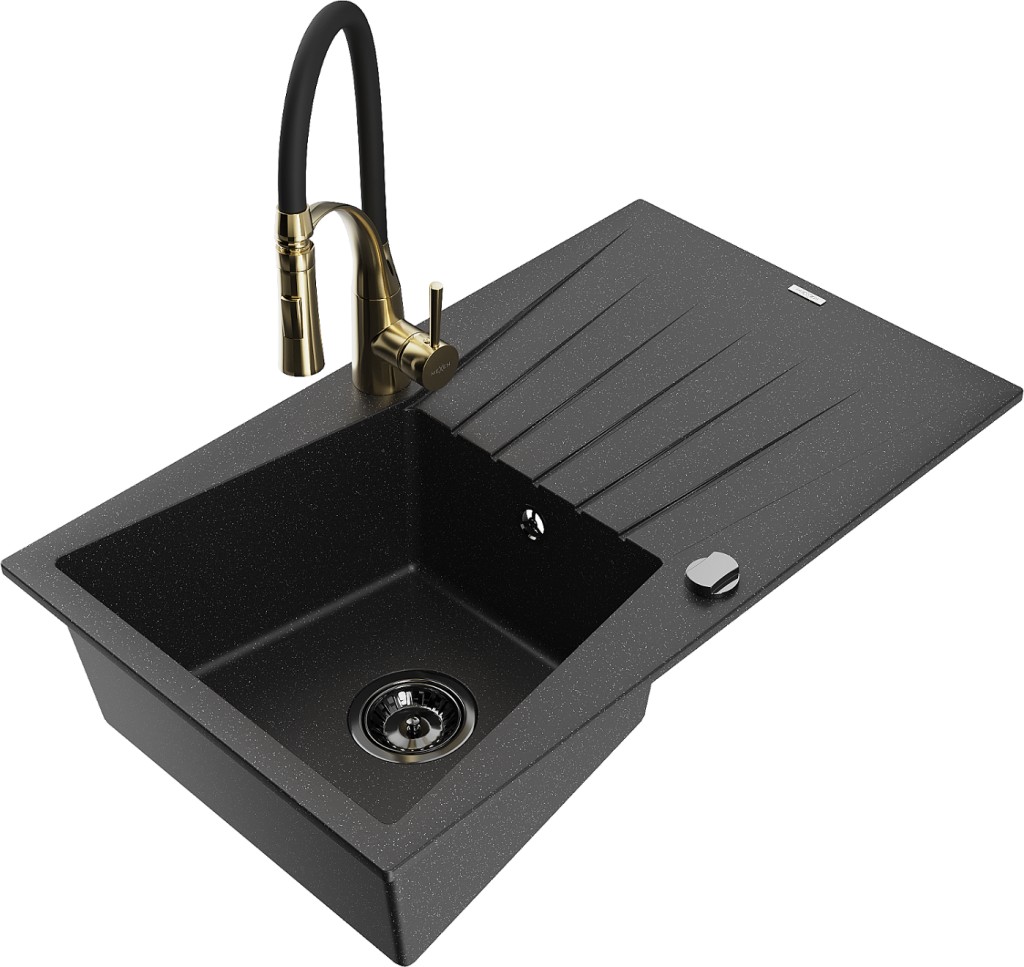 Technické dáta: drez: Rozmer: 775x470x200mm Hĺbka komory: 180 mm Rozmery komory: 410x355 mm Priemer odtoku: ø90 mm Typ: 1-miska s odkvapkávačom Typ: Zapustené do pracovnej dosky Farba: čierna/strieborná metalíza Povrchová úprava sifónu: čierna Materiál: žula (80% žulové kamenivo, 20% živice) Prepadový otvor: Áno Otvory: (batérie, automatické) 2 Inštalácia: Univerzálna, je možné inštalovať s odkvapkávačom na ľavú alebo pravú stranu Vysoká odolnosť proti poškriabaniu a zmene farby Odolnosť proti tepelným šokom Ľahko čistiteľný povrch kuchynská batéria: Materiál: mosadz Farba: Zlatá/Čierna Hlava: Keramická Prevzdušňovač: Áno Typ: Jedna páka Výška batérie: 430 mm Rozsah výtoku: 185 mm Batéria má výsuvný výtok(GT) Ean: 5905315047359
