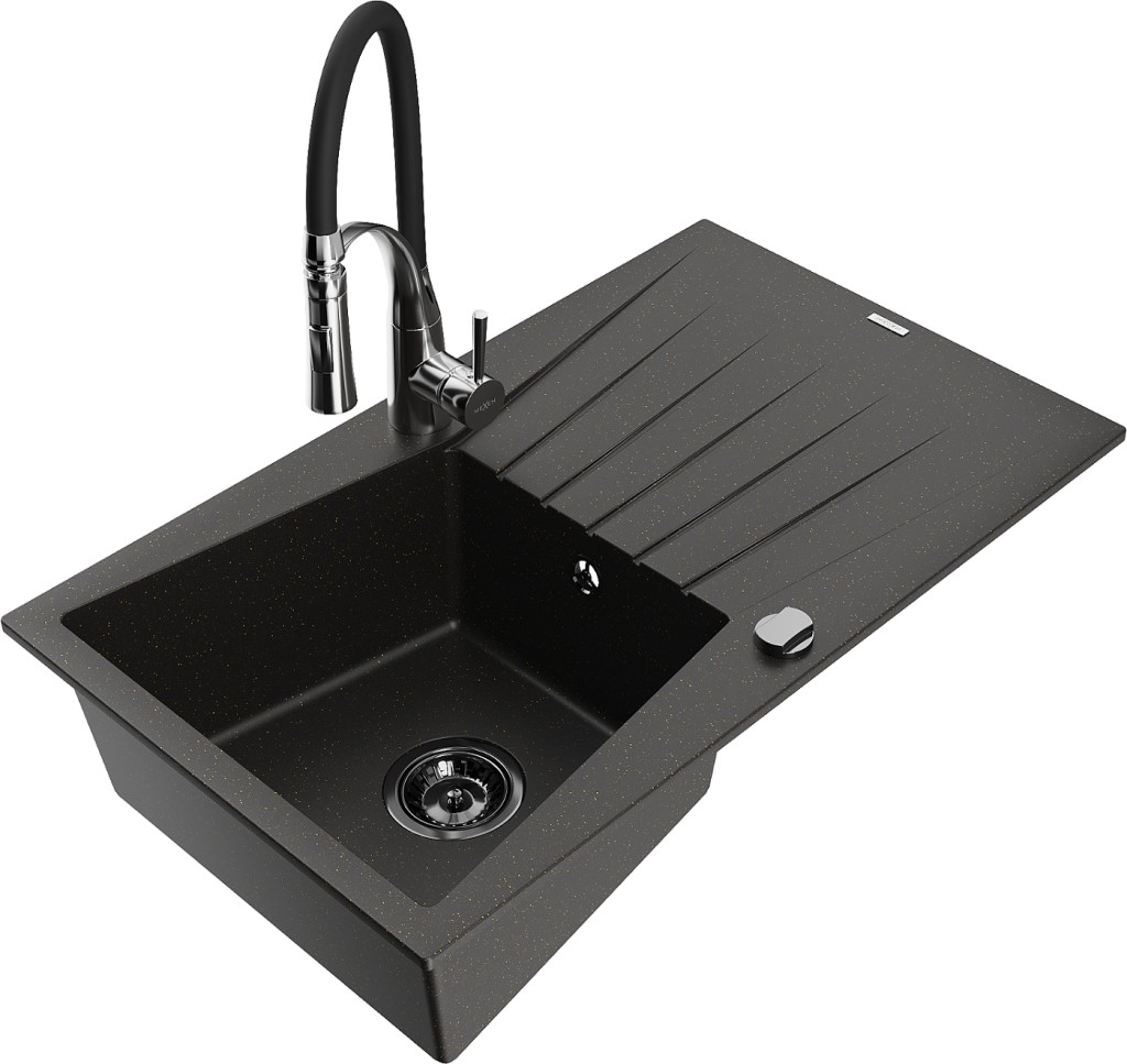 Technické dáta: drez: Rozmer: 775x470x200mm Hĺbka komory: 180 mm Rozmery komory: 410x355 mm Priemer odtoku: ø90 mm Typ: 1-miska s odkvapkávačom Typ: Zapustené do pracovnej dosky Farba: čierna / zlatá metalíza Povrchová úprava sifónu: čierna Materiál: žula (80% žulové kamenivo, 20% živice) Prepadový otvor: Áno Otvory: (batérie, automatické) 2 Inštalácia: Univerzálna, je možné inštalovať s odkvapkávačom na ľavú alebo pravú stranu Vysoká odolnosť proti poškriabaniu a zmene farby Odolnosť proti tepelným šokom Ľahko čistiteľný povrch kuchynská batéria: Materiál: mosadz Farba: chróm/čierna Hlava: Keramická Prevzdušňovač: Áno Typ: Jedna páka Výška batérie: 430 mm Rozsah výtoku: 185 mm Batéria má výsuvný výtok(GT) Ean: 5905315047397