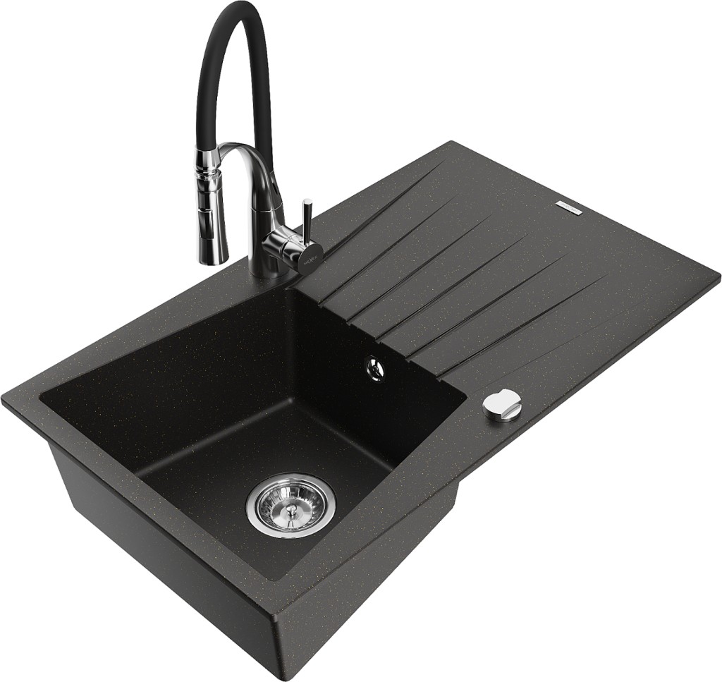 Technické dáta: drez: Rozmer: 775x470x200mm Hĺbka komory: 180 mm Rozmery komory: 410x355 mm Priemer odtoku: ø90 mm Typ: 1-miska s odkvapkávačom Typ: Zapustené do pracovnej dosky Farba: čierna / zlatá metalíza Povrchová úprava sifónu: Chrome Materiál: žula (80% žulové kamenivo, 20% živice) Prepadový otvor: Áno Otvory: (batérie, automatické) 2 Inštalácia: Univerzálna, je možné inštalovať s odkvapkávačom na ľavú alebo pravú stranu Vysoká odolnosť proti poškriabaniu a zmene farby Odolnosť proti tepelným šokom Ľahko čistiteľný povrch kuchynská batéria: Materiál: mosadz Farba: chróm/čierna Hlava: Keramická Prevzdušňovač: Áno Typ: Jedna páka Výška batérie: 430 mm Rozsah výtoku: 185 mm Batéria má výsuvný výtok(GT) Ean: 5905315047380