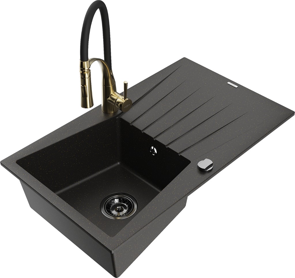Technické dáta: drez: Rozmer: 775x470x200mm Hĺbka komory: 180 mm Rozmery komory: 410x355 mm Priemer odtoku: ø90 mm Typ: 1-miska s odkvapkávačom Typ: Zapustené do pracovnej dosky Farba: čierna / zlatá metalíza Povrchová úprava sifónu: čierna Materiál: žula (80% žulové kamenivo, 20% živice) Prepadový otvor: Áno Otvory: (batérie, automatické) 2 Inštalácia: Univerzálna, je možné inštalovať s odkvapkávačom na ľavú alebo pravú stranu Vysoká odolnosť proti poškriabaniu a zmene farby Odolnosť proti tepelným šokom Ľahko čistiteľný povrch kuchynská batéria: Materiál: mosadz Farba: Zlatá/Čierna Hlava: Keramická Prevzdušňovač: Áno Typ: Jedna páka Výška batérie: 430 mm Rozsah výtoku: 185 mm Batéria má výsuvný výtok(GT) Ean: 5905315047410