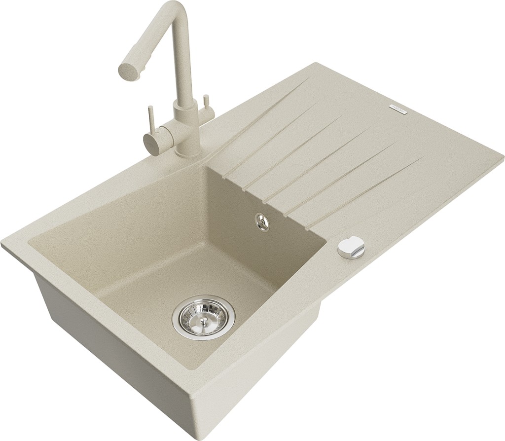 Technické dáta: drez: Rozmer: 775x470x200mm Hĺbka komory: 180 mm Rozmery komory: 410x355 mm Priemer odtoku: ø90 mm Typ: 1-miska s odkvapkávačom Typ: Zapustené do pracovnej dosky Farba béžová Povrchová úprava sifónu: Chrome Materiál: žula (80% žulové kamenivo, 20% živice) Prepadový otvor: Áno Otvory: (batérie, automatické) 2 Inštalácia: Univerzálna, je možné inštalovať s odkvapkávačom na ľavú alebo pravú stranu Vysoká odolnosť proti poškriabaniu a zmene farby Odolnosť proti tepelným šokom Ľahko čistiteľný povrch kuchynská batéria: Materiál: mosadz Farba béžová Hlava: Keramická Prevzdušňovač: Áno Typ: Dve rukoväte Rozsah výtoku: 235 mm Výška batérie: 315 mm Dvojhlavá batéria s prídavným kanálom pre filtrovanú pitnú vodu(GT) Ean: 5905315025586