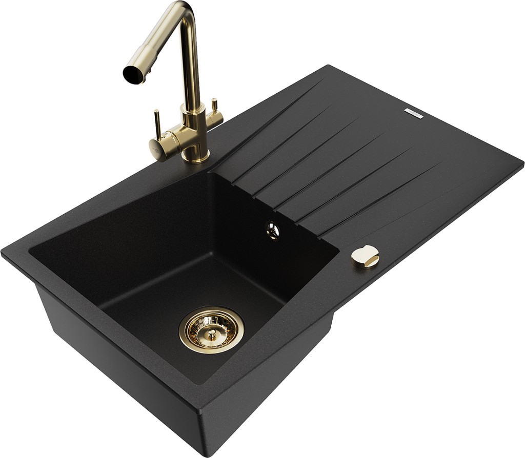 Technické dáta: drez: Rozmer: 775x470x200mm Hĺbka komory: 180 mm Rozmery komory: 410x355 mm Priemer odtoku: ø90 mm Typ: 1-miska s odkvapkávačom Typ: Zapustené do pracovnej dosky Čierna farba Povrchová úprava sifónu: zlatá Materiál: žula (80% žulové kamenivo, 20% živice) Prepadový otvor: Áno Otvory: (batérie, automatické) 2 Inštalácia: Univerzálna, je možné inštalovať s odkvapkávačom na ľavú alebo pravú stranu Vysoká odolnosť proti poškriabaniu a zmene farby Odolnosť proti tepelným šokom Ľahko čistiteľný povrch kuchynská batéria: Materiál: mosadz Farba: Zlatá Hlava: Keramická Prevzdušňovač: Áno Typ: Dve rukoväte Rozsah výtoku: 235 mm Výška batérie: 315 mm Dvojhlavá batéria s prídavným kanálom pre filtrovanú pitnú vodu(GT) Ean: 5905315025814