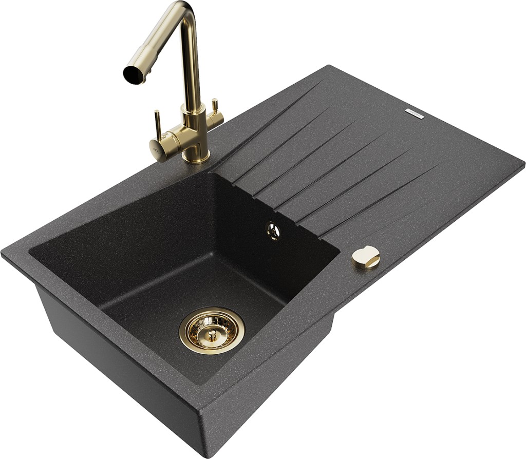 Technické dáta: drez: Rozmer: 775x470x200mm Hĺbka komory: 180 mm Rozmery komory: 410x355 mm Priemer odtoku: ø90 mm Typ: 1-miska s odkvapkávačom Typ: Zapustené do pracovnej dosky Farba: Škvrnitá čierna Povrchová úprava sifónu: zlatá Materiál: žula (80% žulové kamenivo, 20% živice) Prepadový otvor: Áno Otvory: (batérie, automatické) 2 Inštalácia: Univerzálna, je možné inštalovať s odkvapkávačom na ľavú alebo pravú stranu Vysoká odolnosť proti poškriabaniu a zmene farby Odolnosť proti tepelným šokom Ľahko čistiteľný povrch kuchynská batéria: Materiál: mosadz Farba: Zlatá Hlava: Keramická Prevzdušňovač: Áno Typ: Dve rukoväte Rozsah výtoku: 235 mm Výška batérie: 315 mm Dvojhlavá batéria s prídavným kanálom pre filtrovanú pitnú vodu(GT) Ean: 5905315025760