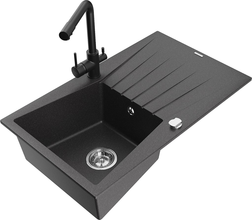 Technické dáta: drez: Rozmer: 775x470x200mm Hĺbka komory: 180 mm Rozmery komory: 410x355 mm Priemer odtoku: ø90 mm Typ: 1-miska s odkvapkávačom Typ: Zapustené do pracovnej dosky Farba: Škvrnitá čierna Povrchová úprava sifónu: Chrome Materiál: žula (80% žulové kamenivo, 20% živice) Prepadový otvor: Áno Otvory: (batérie, automatické) 2 Inštalácia: Univerzálna, je možné inštalovať s odkvapkávačom na ľavú alebo pravú stranu Vysoká odolnosť proti poškriabaniu a zmene farby Odolnosť proti tepelným šokom Ľahko čistiteľný povrch kuchynská batéria: Materiál: mosadz Čierna farba Hlava: Keramická Prevzdušňovač: Áno Typ: Dve rukoväte Rozsah výtoku: 235 mm Výška batérie: 315 mm Dvojhlavá batéria s prídavným kanálom pre filtrovanú pitnú vodu(GT) Ean: 5905315025777