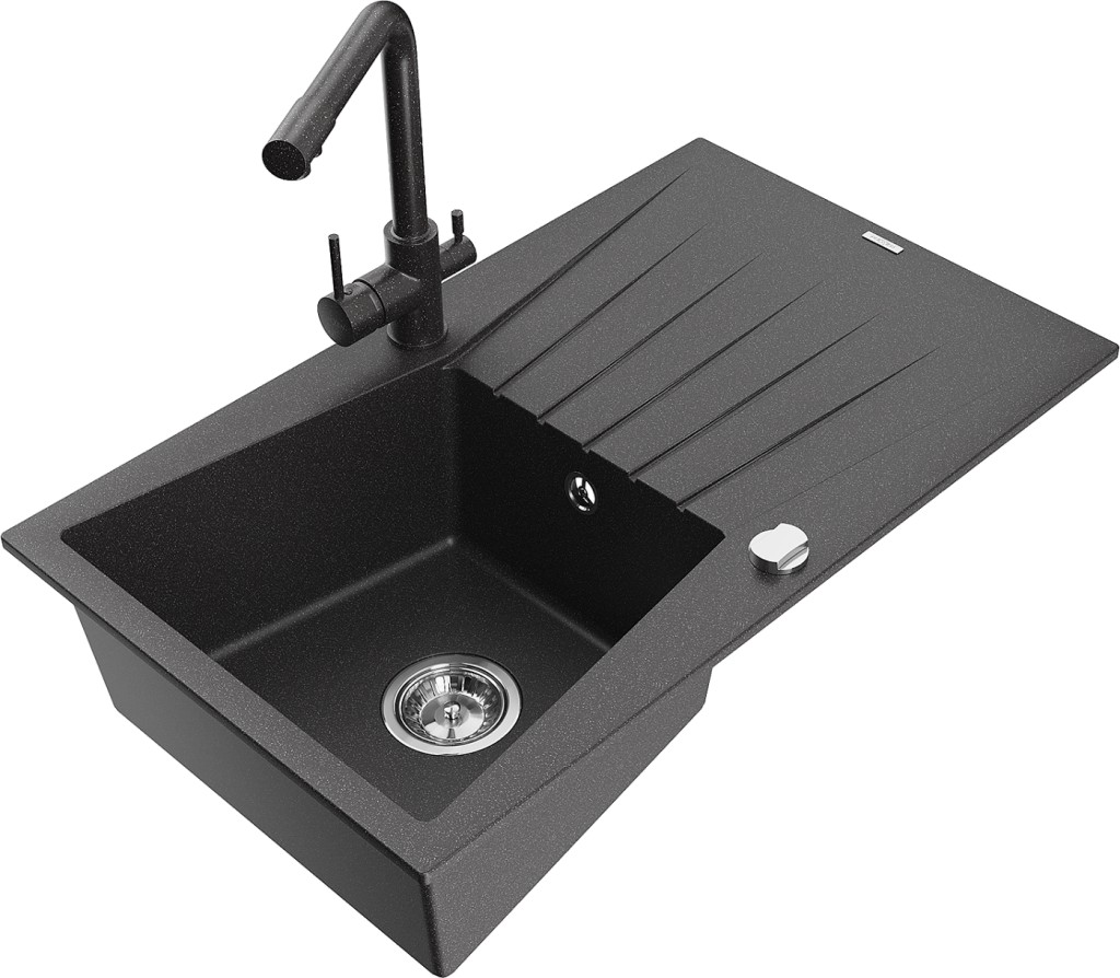 Technické dáta: drez: Rozmer: 775x470x200mm Hĺbka komory: 180 mm Rozmery komory: 410x355 mm Priemer odtoku: ø90 mm Typ: 1-miska s odkvapkávačom Typ: Zapustené do pracovnej dosky Farba: Škvrnitá čierna Povrchová úprava sifónu: Chrome Materiál: žula (80% žulové kamenivo, 20% živice) Prepadový otvor: Áno Otvory: (batérie, automatické) 2 Inštalácia: Univerzálna, je možné inštalovať s odkvapkávačom na ľavú alebo pravú stranu Vysoká odolnosť proti poškriabaniu a zmene farby Odolnosť proti tepelným šokom Ľahko čistiteľný povrch kuchynská batéria: Materiál: mosadz Farba: Škvrnitá čierna Hlava: Keramická Prevzdušňovač: Áno Typ: Dve rukoväte Rozsah výtoku: 235 mm Výška batérie: 315 mm Dvojhlavá batéria s prídavným kanálom pre filtrovanú pitnú vodu(GT) Ean: 5905315025791