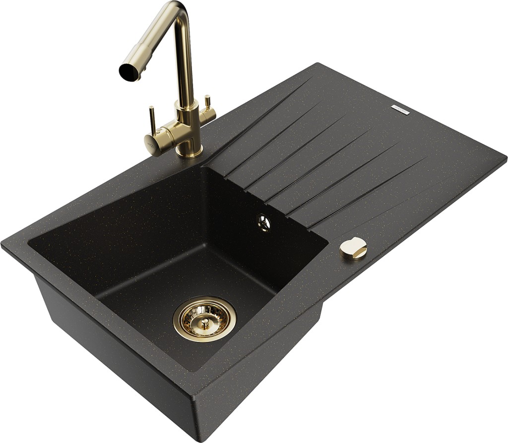 Technické dáta: drez: Rozmer: 775x470x200mm Hĺbka komory: 180 mm Rozmery komory: 410x355 mm Priemer odtoku: ø90 mm Typ: 1-miska s odkvapkávačom Typ: Zapustené do pracovnej dosky Farba: čierna / zlatá metalíza Povrchová úprava sifónu: zlatá Materiál: žula (80% žulové kamenivo, 20% živice) Prepadový otvor: Áno Otvory: (batérie, automatické) 2 Inštalácia: Univerzálna, je možné inštalovať s odkvapkávačom na ľavú alebo pravú stranu Vysoká odolnosť proti poškriabaniu a zmene farby Odolnosť proti tepelným šokom Ľahko čistiteľný povrch kuchynská batéria: Materiál: mosadz Farba: Zlatá Hlava: Keramická Prevzdušňovač: Áno Typ: Dve rukoväte Rozsah výtoku: 235 mm Výška batérie: 315 mm Dvojhlavá batéria s prídavným kanálom pre filtrovanú pitnú vodu(GT) Ean: 5905315025715