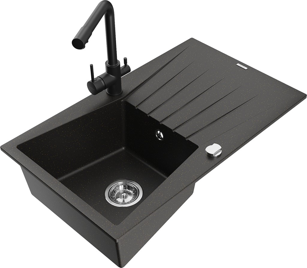 Technické dáta: drez: Rozmer: 775x470x200mm Hĺbka komory: 180 mm Rozmery komory: 410x355 mm Priemer odtoku: ø90 mm Typ: 1-miska s odkvapkávačom Typ: Zapustené do pracovnej dosky Farba: čierna / zlatá metalíza Povrchová úprava sifónu: Chrome Materiál: žula (80% žulové kamenivo, 20% živice) Prepadový otvor: Áno Otvory: (batérie, automatické) 2 Inštalácia: Univerzálna, je možné inštalovať s odkvapkávačom na ľavú alebo pravú stranu Vysoká odolnosť proti poškriabaniu a zmene farby Odolnosť proti tepelným šokom Ľahko čistiteľný povrch kuchynská batéria: Materiál: mosadz Čierna farba Hlava: Keramická Prevzdušňovač: Áno Typ: Dve rukoväte Rozsah výtoku: 235 mm Výška batérie: 315 mm Dvojhlavá batéria s prídavným kanálom pre filtrovanú pitnú vodu(GT) Ean: 5905315025746