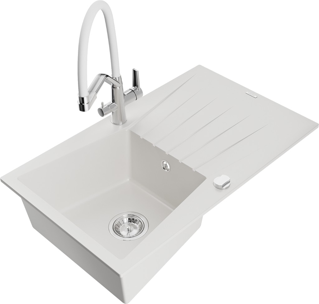 Technické dáta: drez: Rozmer: 775x470x200mm Hĺbka komory: 180 mm Rozmery komory: 410x355 mm Priemer odtoku: ø90 mm Typ: 1-miska s odkvapkávačom Typ: Zapustené do pracovnej dosky biela farba Povrchová úprava sifónu: Chrome Materiál: žula (80% žulové kamenivo, 20% živice) Prepadový otvor: Áno Otvory: (batérie, automatické) 2 Inštalácia: Univerzálna, je možné inštalovať s odkvapkávačom na ľavú alebo pravú stranu Vysoká odolnosť proti poškriabaniu a zmene farby Odolnosť proti tepelným šokom Ľahko čistiteľný povrch kuchynská batéria: Materiál: mosadz Farba: chróm/biela Hlavy: Keramické Prevzdušňovač: Áno Typ hubica: Flexibilný s mosadzným držiakom Rozsah výtoku: 260 mm Výška: 405 mm Typ: Dve rukoväte Dvojhlavá batéria s prídavným filtrom na pitnú vodu(GT) Ean: 5905315102249