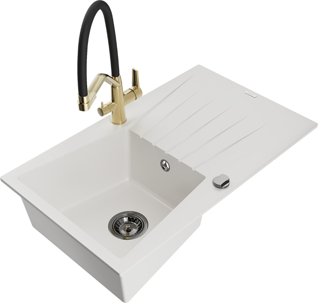 Technické dáta: drez: Rozmer: 775x470x200mm Hĺbka komory: 180 mm Rozmery komory: 410x355 mm Priemer odtoku: ø90 mm Typ: 1-miska s odkvapkávačom Typ: Zapustené do pracovnej dosky biela farba Povrchová úprava sifónu: čierna Materiál: žula (80% žulové kamenivo, 20% živice) Prepadový otvor: Áno Otvory: (batérie, automatické) 2 Inštalácia: Univerzálna, je možné inštalovať s odkvapkávačom na ľavú alebo pravú stranu Vysoká odolnosť proti poškriabaniu a zmene farby Odolnosť proti tepelným šokom Ľahko čistiteľný povrch kuchynská batéria: Materiál: mosadz Farba: Zlatá/Čierna Hlavy: Keramické Prevzdušňovač: Áno Typ hubica: Flexibilný s mosadzným držiakom Rozsah výtoku: 260 mm Výška: 405 mm Typ: Dve rukoväte Dvojhlavá batéria s prídavným filtrom na pitnú vodu(GT) Ean: 5905315102287