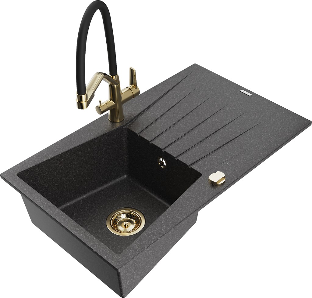 Technické dáta: drez: Rozmer: 775x470x200mm Hĺbka komory: 180 mm Rozmery komory: 410x355 mm Priemer odtoku: ø90 mm Typ: 1-miska s odkvapkávačom Typ: Zapustené do pracovnej dosky Farba: Škvrnitá čierna Povrchová úprava sifónu: zlatá Materiál: žula (80% žulové kamenivo, 20% živice) Prepadový otvor: Áno Otvory: (batérie, automatické) 2 Inštalácia: Univerzálna, je možné inštalovať s odkvapkávačom na ľavú alebo pravú stranu Vysoká odolnosť proti poškriabaniu a zmene farby Odolnosť proti tepelným šokom Ľahko čistiteľný povrch kuchynská batéria: Materiál: mosadz Farba: Zlatá/Čierna Hlavy: Keramické Prevzdušňovač: Áno Typ hubica: Flexibilný s mosadzným držiakom Rozsah výtoku: 260 mm Výška: 405 mm Typ: Dve rukoväte Dvojhlavá batéria s prídavným filtrom na pitnú vodu(GT) Ean: 5905315102522