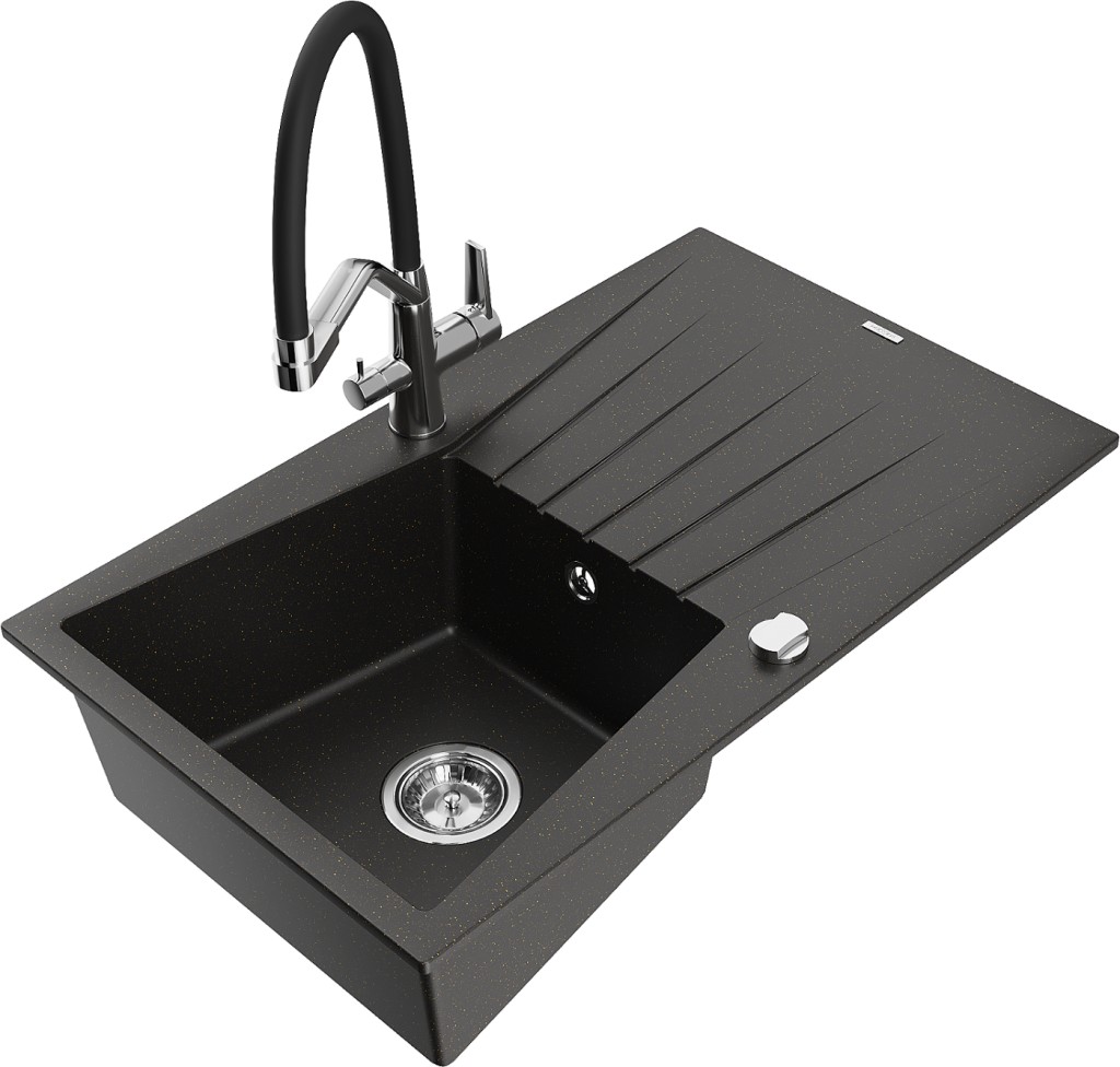 Technické dáta: drez: Rozmer: 775x470x200mm Hĺbka komory: 180 mm Rozmery komory: 410x355 mm Priemer odtoku: ø90 mm Typ: 1-miska s odkvapkávačom Typ: Zapustené do pracovnej dosky Farba: čierna / zlatá metalíza Povrchová úprava sifónu: Chrome Materiál: žula (80% žulové kamenivo, 20% živice) Prepadový otvor: Áno Otvory: (batérie, automatické) 2 Inštalácia: Univerzálna, je možné inštalovať s odkvapkávačom na ľavú alebo pravú stranu Vysoká odolnosť proti poškriabaniu a zmene farby Odolnosť proti tepelným šokom Ľahko čistiteľný povrch kuchynská batéria: Materiál: mosadz Farba: chróm/čierna Hlavy: Keramické Prevzdušňovač: Áno Typ hubica: Flexibilný s mosadzným držiakom Rozsah výtoku: 260 mm Výška: 405 mm Typ: Dve rukoväte Dvojhlavá batéria s prídavným filtrom na pitnú vodu(GT) Ean: 5905315102454