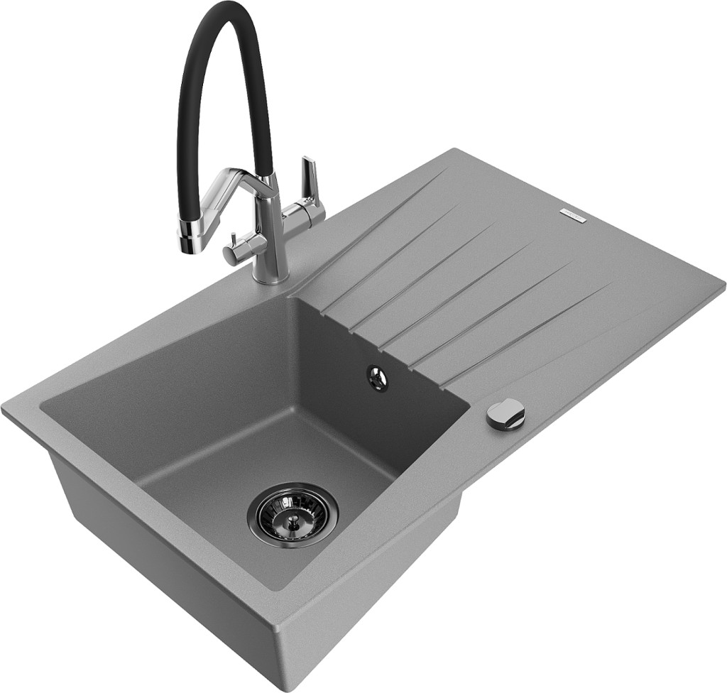 Technické dáta: drez: Rozmer: 775x470x200mm Hĺbka komory: 180 mm Rozmery komory: 410x355 mm Priemer odtoku: ø90 mm Typ: 1-miska s odkvapkávačom Typ: Zapustené do pracovnej dosky Šedá farba Povrchová úprava sifónu: čierna Materiál: žula (80% žulové kamenivo, 20% živice) Prepadový otvor: Áno Otvory: (batérie, automatické) 2 Inštalácia: Univerzálna, je možné inštalovať s odkvapkávačom na ľavú alebo pravú stranu Vysoká odolnosť proti poškriabaniu a zmene farby Odolnosť proti tepelným šokom Ľahko čistiteľný povrch kuchynská batéria: Materiál: mosadz Farba: chróm/čierna Hlavy: Keramické Prevzdušňovač: Áno Typ hubica: Flexibilný s mosadzným držiakom Rozsah výtoku: 260 mm Výška: 405 mm Typ: Dve rukoväte Dvojhlavá batéria s prídavným filtrom na pitnú vodu(GT) Ean: 5905315102362