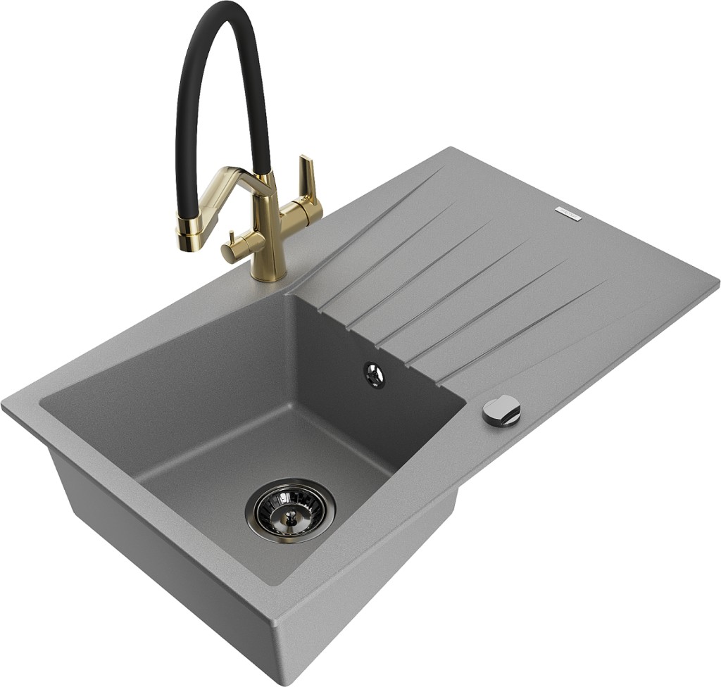 Technické dáta: drez: Rozmer: 775x470x200mm Hĺbka komory: 180 mm Rozmery komory: 410x355 mm Priemer odtoku: ø90 mm Typ: 1-miska s odkvapkávačom Typ: Zapustené do pracovnej dosky Šedá farba Povrchová úprava sifónu: čierna Materiál: žula (80% žulové kamenivo, 20% živice) Prepadový otvor: Áno Otvory: (batérie, automatické) 2 Inštalácia: Univerzálna, je možné inštalovať s odkvapkávačom na ľavú alebo pravú stranu Vysoká odolnosť proti poškriabaniu a zmene farby Odolnosť proti tepelným šokom Ľahko čistiteľný povrch kuchynská batéria: Materiál: mosadz Farba: Zlatá/Čierna Hlavy: Keramické Prevzdušňovač: Áno Typ hubica: Flexibilný s mosadzným držiakom Rozsah výtoku: 260 mm Výška: 405 mm Typ: Dve rukoväte Dvojhlavá batéria s prídavným filtrom na pitnú vodu(GT) Ean: 5905315102386