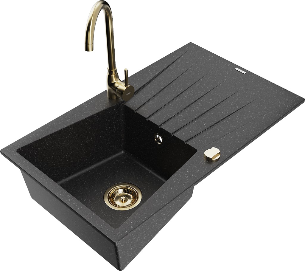 Technické dáta: drez: Rozmer: 775x470x200mm Hĺbka komory: 180 mm Rozmery komory: 410x355 mm Priemer odtoku: ø90 mm Typ: 1-miska s odkvapkávačom Typ: Zapustené do pracovnej dosky Farba: čierna/strieborná metalíza Povrchová úprava sifónu: zlatá Materiál: žula (80% žulové kamenivo, 20% živice) Prepadový otvor: Áno Otvory: (batérie, automatické) 2 Inštalácia: Univerzálna, je možné inštalovať s odkvapkávačom na ľavú alebo pravú stranu Vysoká odolnosť proti poškriabaniu a zmene farby Odolnosť proti tepelným šokom Ľahko čistiteľný povrch kuchynská batéria: Materiál: mosadz Farba: Zlatá Hlava: Keramická Prevzdušňovač: Áno Typ: jednopáková Výška batérie: 335 mm Rozsah výtoku: 180 mm(GT) Ean: 5905315015662