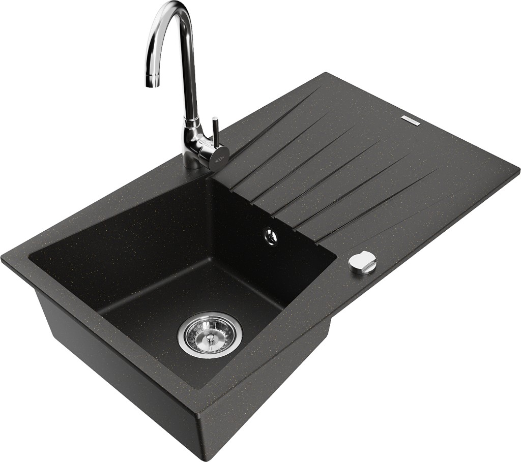 Technické dáta: drez: Rozmer: 775x470x200mm Hĺbka komory: 180 mm Rozmery komory: 410x355 mm Priemer odtoku: ø90 mm Typ: 1-miska s odkvapkávačom Typ: Zapustené do pracovnej dosky Farba: čierna / zlatá metalíza Povrchová úprava sifónu: Chrome Materiál: žula (80% žulové kamenivo, 20% živice) Prepadový otvor: Áno Otvory: (batérie, automatické) 2 Inštalácia: Univerzálna, je možné inštalovať s odkvapkávačom na ľavú alebo pravú stranu Vysoká odolnosť proti poškriabaniu a zmene farby Odolnosť proti tepelným šokom Ľahko čistiteľný povrch kuchynská batéria: Materiál: mosadz Farba: Chrome Hlava: Keramická Prevzdušňovač: Áno Typ: Jedna páka Výška batérie: 335 mm Rozsah výtoku: 180 mm(GT) Ean: 5905315015686