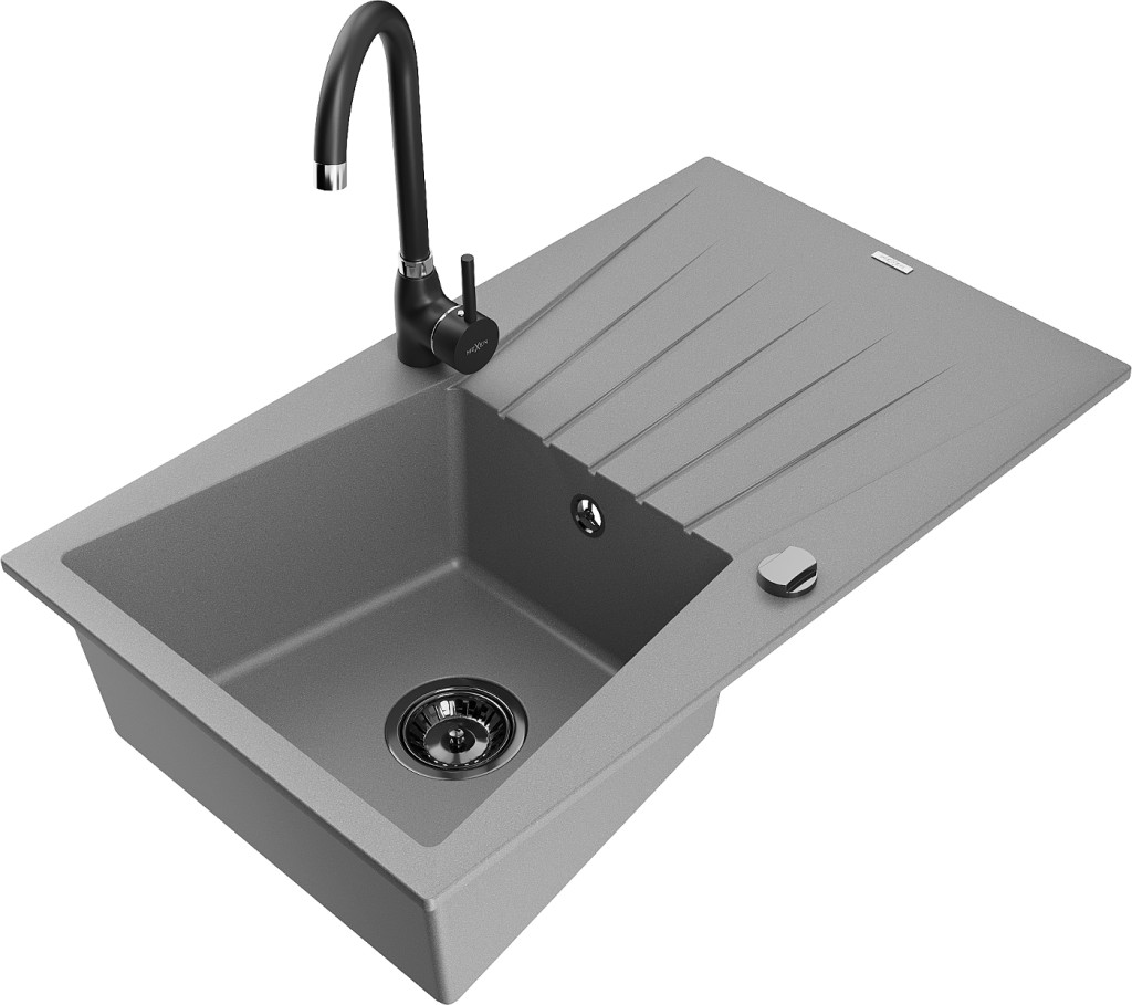 Technické dáta: drez: Rozmer: 775x470x200mm Hĺbka komory: 180 mm Rozmery komory: 410x355 mm Priemer odtoku: ø90 mm Typ: 1-miska s odkvapkávačom Typ: Zapustené do pracovnej dosky Šedá farba Povrchová úprava sifónu: čierna Materiál: žula (80% žulové kamenivo, 20% živice) Prepadový otvor: Áno Otvory: (batérie, automatické) 2 Inštalácia: Univerzálna, je možné inštalovať s odkvapkávačom na ľavú alebo pravú stranu Vysoká odolnosť proti poškriabaniu a zmene farby Odolnosť proti tepelným šokom Ľahko čistiteľný povrch kuchynská batéria: Materiál: mosadz Čierna farba Hlava: Keramická Prevzdušňovač: Áno Typ: Jedna páka Výška batérie: 335 mm Rozsah výtoku: 180 mm(GT) Ean: 5905315015655