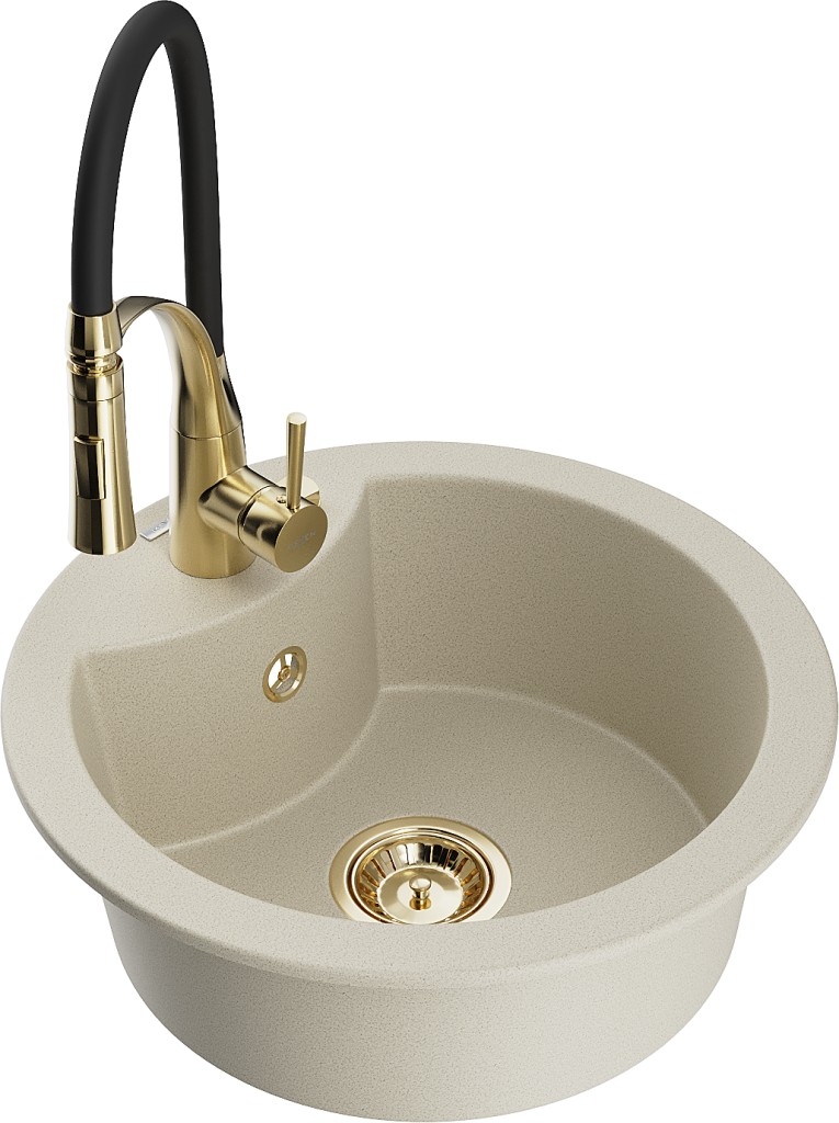 Technické dáta: Drez: Rozmer: 488x488x167 mm Hĺbka komory: 157 mm Šírka komory: 406 mm Priemer odtoku: ø90 mm Typ: 1-komorový Typ: Zapustené do pracovnej dosky Farba béžová Povrchová úprava sifónu: zlatá Materiál: žula (80% žulové kamenivo 20% živice) Prepadový otvor: Áno Otvory: (batérie, automat) 2 Vysoká odolnosť proti poškriabaniu a zmene farby Odolnosť proti tepelným šokom Povrch pre ľahké čistenie Jeden dodatočný vyfrézovaný otvor na samodierovanie ø35 Kuchynská batéria: Materiál: mosadz Farba: Zlatá/Čierna Hlava: Keramická Perlátor: Áno Typ výtoku: Flexibilný s mosadznou podperou Typ: Jednopáková Výška batérie: 430 mm Rozsah výtoku: 235 mm(GT) Ean: 5905315046383