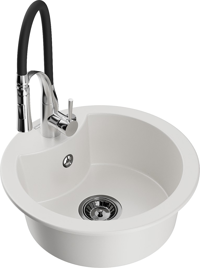 Technické dáta: drez: Rozmery: 488 x 488 x 167 mm Hĺbka komory: 157 mm Šírka komory: 406 mm Priemer odtoku: ø90 mm Typ: 1-komorový Typ: Zapustené do pracovnej dosky biela farba Povrchová úprava sifónu: čierna Materiál: žula (80% žulové kamenivo, 20% živice) Prepadový otvor: Áno Otvory: (batérie, automatické) 2 Vysoká odolnosť proti poškriabaniu a zmene farby Odolnosť proti tepelným šokom Ľahko čistiteľný povrch Jeden dodatočný vyfrézovaný otvor na samodierovanie ø35 kuchynská batéria: Materiál: mosadz Farba: chróm/čierna Hlava: Keramická Prevzdušňovač: Áno Typ: Jedna páka Výška batérie: 430 mm Rozsah výtoku: 185 mm Batéria má výsuvný výtok(GT) Ean: 5905315046314