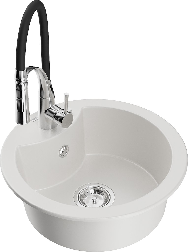 Technické dáta: drez: Rozmery: 488 x 488 x 167 mm Hĺbka komory: 157 mm Šírka komory: 406 mm Priemer odtoku: ø90 mm Typ: 1-komorový Typ: Zapustené do pracovnej dosky biela farba Povrchová úprava sifónu: Chrome Materiál: žula (80% žulové kamenivo, 20% živice) Prepadový otvor: Áno Otvory: (batérie, automatické) 2 Vysoká odolnosť proti poškriabaniu a zmene farby Odolnosť proti tepelným šokom Ľahko čistiteľný povrch Jeden dodatočný vyfrézovaný otvor na samodierovanie ø35 kuchynská batéria: Materiál: mosadz Farba: chróm/čierna Hlava: Keramická Prevzdušňovač: Áno Typ: Jedna páka Výška batérie: 430 mm Rozsah výtoku: 185 mm Batéria má výsuvný výtok(GT) Ean: 5905315046307