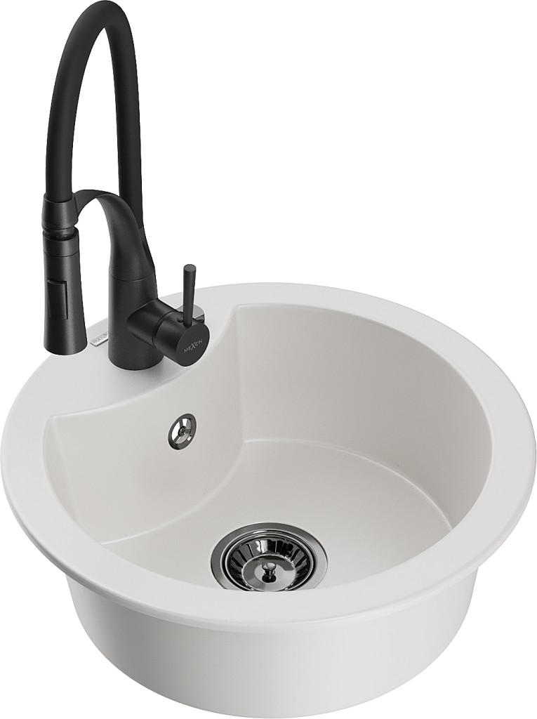 Technické dáta: drez: Rozmery: 488 x 488 x 167 mm Hĺbka komory: 157 mm Šírka komory: 406 mm Priemer odtoku: ø90 mm Typ: 1-komorový Typ: Zapustené do pracovnej dosky biela farba Povrchová úprava sifónu: čierna Materiál: žula (80% žulové kamenivo, 20% živice) Prepadový otvor: Áno Otvory: (batérie, automatické) 2 Vysoká odolnosť proti poškriabaniu a zmene farby Odolnosť proti tepelným šokom Ľahko čistiteľný povrch Jeden dodatočný vyfrézovaný otvor na samodierovanie ø35 kuchynská batéria: Materiál: mosadz Čierna farba Hlava: Keramická Prevzdušňovač: Áno Typ: Jedna páka Výška batérie: 430 mm Rozsah výtoku: 185 mm Batéria má výsuvný výtok(GT) Ean: 5905315046345
